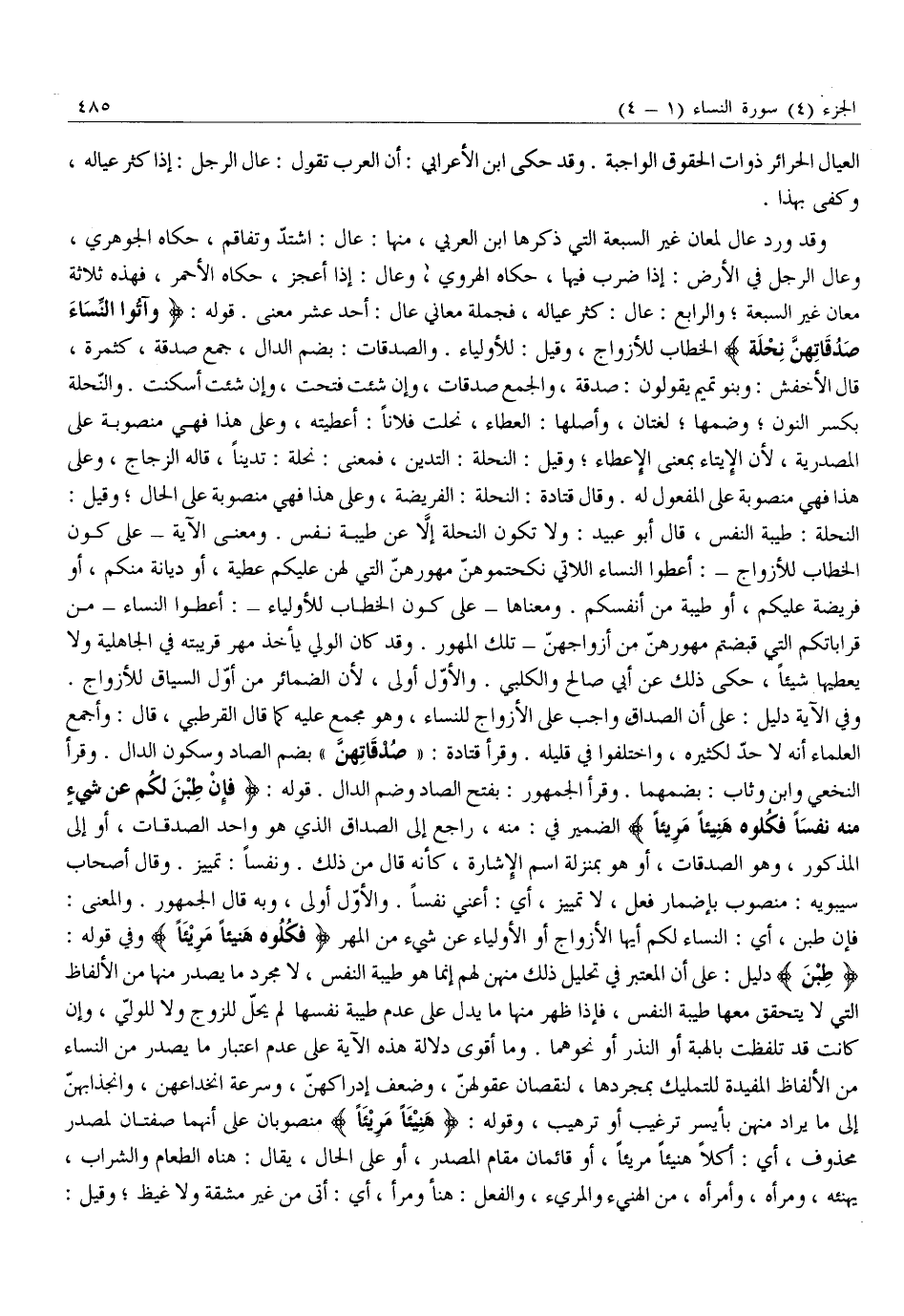 طِبْنَ دَلِيلٌ: عَلَى أَنَّ الْمُعْتَبَرَ فِي تَحْلِيلِ ذَلِكَ مِنْهُنَّ لَهُمْ إِنَّمَا هُوَ طِيبَةُ النَّفْسِ، لَا مُجَرَّدَ مَا يَصْدُرُ مِنْهَا مِنَ الْأَلْفَاظِ الَّتِي لَا يَتَحَقَّقُ مَعَهَا طِيبَةُ النَّفْسِ، فَإِذَا ظَهَرَ مِنْهَا مَا يَدُلُّ عَلَى عَدَمِ طِيبَةِ نَفْسِهَا لَمْ يَحِلَّ لِلزَّوْجِ وَلَا لِلْوَلِيِّ، وَإِنْ كَانَتْ قَدْ تَلَفَّظَتْ بِالْهِبَةِ أَوِ النَّذْرِ أَوْ نَحْوِهِمَا. وَمَا أَقْوَى دَلَالَةَ هَذِهِ الْآيَةِ عَلَى عَدَمِ اعْتِبَارِ مَا يَصْدُرُ مِنَ النِّسَاءِ مِنَ الْأَلْفَاظِ الْمُفِيدَةِ لِلتَّمْلِيكِ بِمُجَرَّدِهَا، لِنُقْصَانِ عُقُولِهِنَّ، وَضَعْفِ إِدْرَاكِهِنَّ، وَسُرْعَةِ انخذاعهن، وَانْجِذَابِهِنَّ إِلَى مَا يُرَادُ مِنْهُنَّ بِأَيْسَرِ تَرْغِيبٍ أَوْ تَرْهِيبٍ، وَقَوْلُهُ: هَنِيئاً مَرِيئاً مَنْصُوبَانِ عَلَى أَنَّهُمَا صِفَتَانِ لِمَصْدَرٍ مَحْذُوفٍ، أَيْ: أَكْلًا هَنِيئًا مَرِيئًا، أَوْ قَائِمَانِ مَقَامَ الْمَصْدَرِ، أَوْ عَلَى الحال، يقال: هناه الطعام والشراب، يهنئه، وَمَرَأَهُ، وَأَمْرَأَهُ، مِنَ الْهَنِيءِ وَالْمَرِيءِ، وَالْفِعْلُ: هَنَأَ وَمَرَأَ، أَيْ: أَتَى مِنْ غَيْرِ مَشَقَّةٍ وَلَا غيظ وقيل: