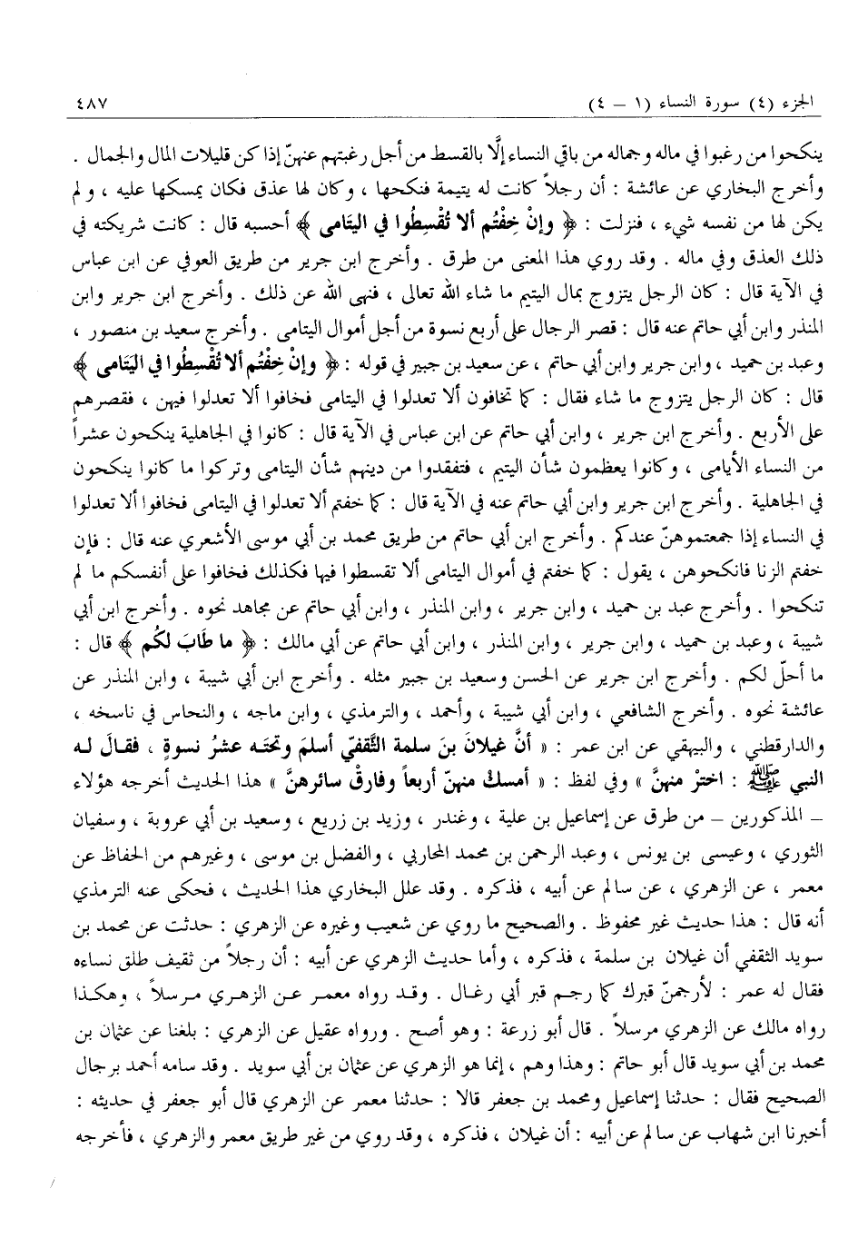 مَا أُحِلَّ لَكُمْ. وَأَخْرَجَ ابْنُ جَرِيرٍ عَنِ الْحَسَنِ وَسَعِيدِ بْنِ جُبَيْرٍ مِثْلَهُ. وَأَخْرَجَ ابْنُ أَبِي شَيْبَةَ، وَابْنُ الْمُنْذِرِ عَنْ عَائِشَةَ نَحْوَهُ. وَأَخْرَجَ الشَّافِعِيُّ، وَابْنُ أَبِي شَيْبَةَ، وَأَحْمَدُ، وَالتِّرْمِذِيُّ، وَابْنُ مَاجَهْ، وَالنَّحَّاسُ فِي نَاسِخِهِ، وَالدَّارَقُطْنِيُّ، وَالْبَيْهَقِيُّ عَنِ ابْنِ عُمَرَ: «أَنَّ غَيْلَانَ بْنَ سَلَمَةَ الثَّقَفِيَّ أَسْلَمَ وَتَحْتَهُ عَشْرُ نِسْوَةٍ، فَقَالَ لَهُ النَّبِيُّ صلّى الله عليه وَسَلَّمَ: اخْتَرْ مِنْهُنَّ» وَفِي لَفْظٍ: «أَمْسِكْ مِنْهُنَّ أَرْبَعًا وَفَارِقْ سَائِرَهُنَّ» هَذَا الْحَدِيثُ أَخْرَجَهُ هَؤُلَاءِ- المذكورين- من طرق عن إسماعيل بن عُلَيَّةَ، وَغُنْدَرٍ، وَزَيْدِ بْنِ زُرَيْعٍ، وَسَعِيدِ بْنِ أَبِي عَرُوبَةَ، وَسُفْيَانَ الثَّوْرِيِّ، وَعِيسَى بْنِ يُونُسَ، وَعَبْدِ الرَّحْمَنِ بْنِ مُحَمَّدٍ الْمُحَارِبِيِّ، وَالْفَضْلِ بْنِ مُوسَى، وَغَيْرِهِمْ مِنَ الْحُفَّاظِ عَنْ مَعْمَرٍ، عَنِ الزُّهْرِيِّ، عَنْ سَالِمٍ عَنْ أَبِيهِ، فَذَكَرَهُ. وَقَدْ عَلَّلَ الْبُخَارِيُّ هَذَا الْحَدِيثَ، فَحَكَى عَنْهُ التِّرْمِذِيُّ أَنَّهُ قَالَ: هَذَا حَدِيثٌ غَيْرُ مَحْفُوظٍ. وَالصَّحِيحُ مَا رُوِيَ عَنْ شُعَيْبٍ وَغَيْرِهِ عَنِ الزُّهْرِيِّ: حُدِّثْتُ عَنْ مُحَمَّدِ بْنِ سُوِيدٍ الثَّقَفِيِّ أَنَّ غَيْلَانَ بْنَ سَلَمَةَ، فَذَكَرَهُ، وَأَمَّا حَدِيثُ الزُّهْرِيِّ عَنْ أَبِيهِ: أَنَّ رَجُلًا مِنْ ثَقِيفٍ طَلَّقَ نِسَاءَهُ فَقَالَ لَهُ عُمَرُ: لَأَرْجُمَنَّ قَبْرَكَ كَمَا رُجِمَ قَبْرُ أَبِي رِغَالٍ. وَقَدْ رَوَاهُ مَعْمَرٌ عَنِ الزُّهْرِيِّ مُرْسَلًا، وَهَكَذَا رَوَاهُ مَالِكٌ عَنِ الزُّهْرِيِّ مُرْسَلًا. قَالَ أَبُو زُرْعَةَ: وَهُوَ أَصَحُّ. وَرَوَاهُ عُقَيْلٌ عَنِ الزُّهْرِيِّ: بَلَغَنَا عَنْ عُثْمَانَ بْنِ مُحَمَّدِ بْنِ أَبِي سُوِيدٍ قَالَ أَبُو حاتم: وهذا وهم، إنما هو الزهري عَنْ عُثْمَانَ بْنِ أَبِي سُوِيدٍ. وَقَدْ سَامَهُ أَحْمَدُ بِرِجَالِ الصَّحِيحِ فَقَالَ: حَدَّثَنَا إِسْمَاعِيلُ وَمُحَمَّدُ بْنُ جَعْفَرٍ قَالَا: حَدَّثَنَا مَعْمَرٌ عَنِ الزُّهْرِيِّ قَالَ أَبُو جَعْفَرٍ فِي حَدِيثِهِ: