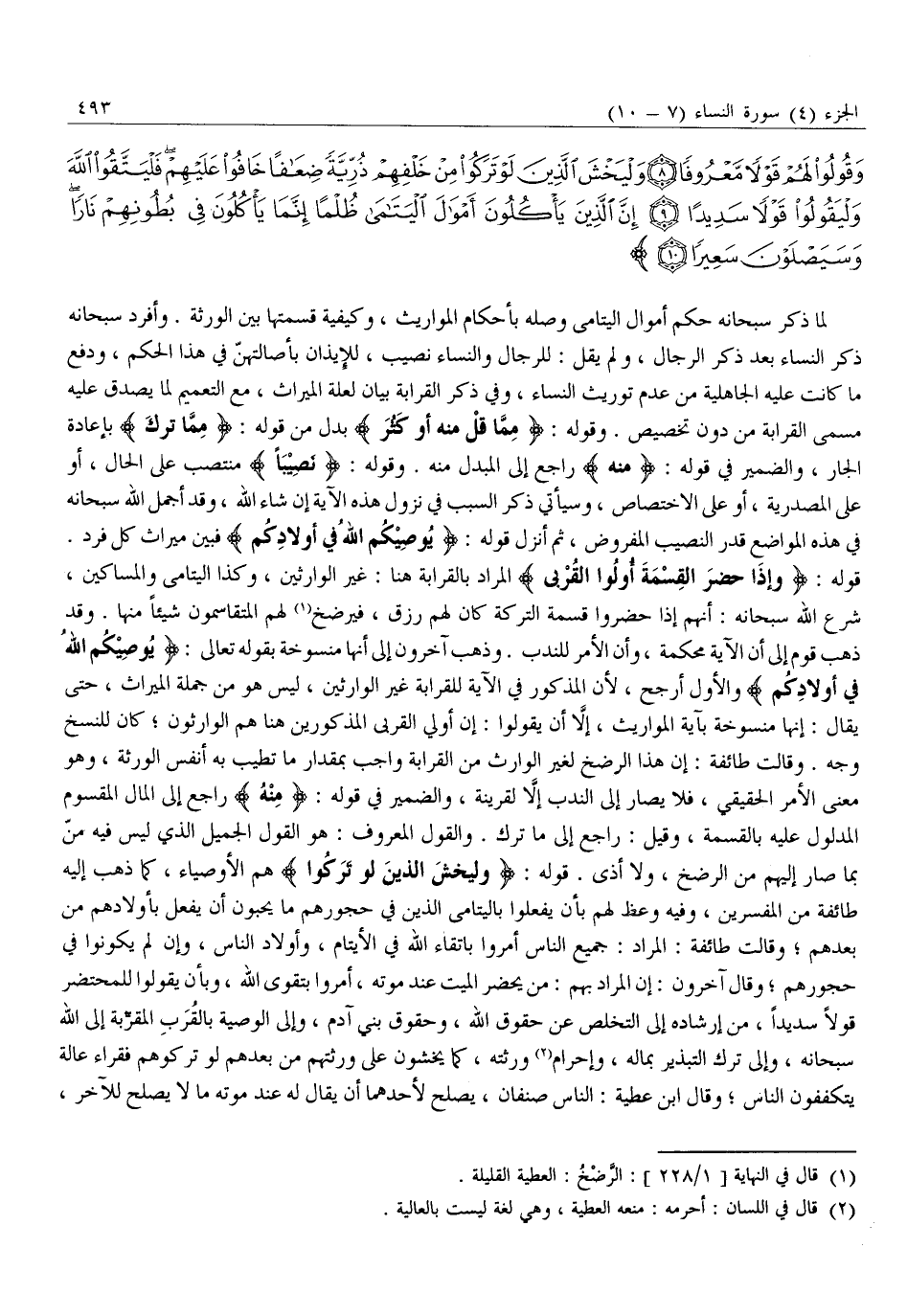 لِلرِّجالِ نَصِيبٌ مِمَّا تَرَكَ الْوالِدانِ وَالْأَقْرَبُونَ وَلِلنِّساءِ نَصِيبٌ مِمَّا تَرَكَ الْوالِدانِ وَالْأَقْرَبُونَ مِمَّا قَلَّ مِنْهُ أَوْ كَثُرَ نَصِيباً مَفْرُوضاً (7) وَإِذا حَضَرَ الْقِسْمَةَ أُولُوا الْقُرْبى وَالْيَتامى وَالْمَساكِينُ فَارْزُقُوهُمْ مِنْهُ وَقُولُوا لَهُمْ قَوْلاً مَعْرُوفاً (8) وَلْيَخْشَ الَّذِينَ لَوْ تَرَكُوا مِنْ خَلْفِهِمْ ذُرِّيَّةً ضِعافاً خافُوا عَلَيْهِمْ فَلْيَتَّقُوا اللَّهَ وَلْيَقُولُوا قَوْلاً سَدِيداً (9) إِنَّ الَّذِينَ يَأْكُلُونَ أَمْوالَ الْيَتامى ظُلْماً إِنَّما يَأْكُلُونَ فِي بُطُونِهِمْ نَارًا وَسَيَصْلَوْنَ سَعِيراً (10)