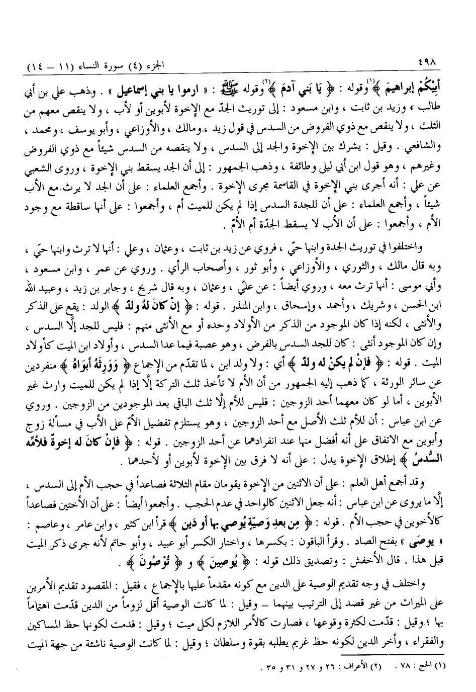 وقوله: يا بَنِي آدَمَ «2» وقوله صلّى الله عليه وَسَلَّمَ: «ارْمُوا يَا بَنِي إِسْمَاعِيلَ» . وَذَهَبَ عَلِيُّ بْنُ أَبِي طَالِبٍ، وَزَيْدُ بْنُ ثَابِتٍ، وَابْنُ مَسْعُودٍ: إِلَى تَوْرِيثِ الْجَدِّ مَعَ الْإِخْوَةِ لِأَبَوَيْنِ أَوْ لِأَبٍ، وَلَا يُنْقِصُ مَعَهُمْ مِنَ الثُّلْثِ، وَلَا يُنْقِصُ مَعَ ذَوِي الْفُرُوضِ مِنَ السُّدُسِ في قول زيد، ومالك، والأوزاعي، وأبو يوسف، ومحمد، والشافعي. وقيل: يشرك بين الإخوة والجد إِلَى السُّدُسِ، وَلَا يَنْقُصُهُ مِنَ السُّدْسِ شَيْئًا مَعَ ذَوِي الْفُرُوضِ وَغَيْرِهِمْ، وَهُوَ قَوْلُ ابْنِ أَبِي لَيْلَى وَطَائِفَةٍ، وَذَهَبَ الْجُمْهُورُ: إِلَى أَنَّ الْجَدَّ يُسْقِطُ بَنِي الْإِخْوَةِ، وَرَوَى الشَّعْبِيُّ عَنْ عَلِيٍّ: أَنَّهُ أَجْرَى بَنِي الْإِخْوَةِ فِي الْقَاسِمَةِ مَجْرَى الْإِخْوَةِ. وَأَجْمَعَ الْعُلَمَاءُ: عَلَى أَنَّ الْجَدَّ لَا يَرِثُ مَعَ الْأَبِ شَيْئًا، وَأَجْمَعَ الْعُلَمَاءُ: عَلَى أَنَّ لِلْجَدَّةِ السُّدُسَ إِذَا لَمْ يَكُنْ للميت أم، وأجمعوا: على أنها ساقطة مع وجود الأم، وَأَجْمَعُوا: عَلَى أَنَّ الْأَبَ لَا يُسْقِطُ الْجَدَّةَ أُمَّ الْأُمَّ.