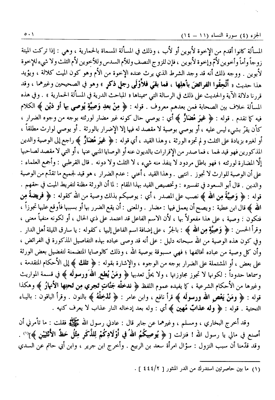 عَلَى أَنَّ الْوَصِيَّةَ لِلْوَارِثِ لَا تَجُوزُ. انْتَهَى. وَهَذَا الْقَيْدُ، أَعْنِي: عَدَمَ الضِّرَارِ، هُوَ قَيْدٌ لِجَمِيعِ مَا تَقَدَّمَ مِنَ الْوَصِيَّةِ وَالدِّينِ. قَالَ أَبُو السُّعُودِ فِي تَفْسِيرِهِ: وَتَخْصِيصُ الْقَيْدِ بِهَذَا الْمَقَامِ: لِمَا أَنَّ الْوَرَثَةَ مَظِنَّةٌ لِتَفْرِيطِ الْمَيِّتِ فِي حَقِّهِمْ.