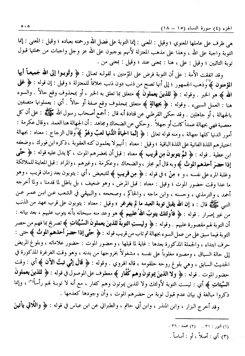 أُمُورُ الدُّنْيَا كُلُّهَا جَهَالَةٌ، وَمِنْهُ قَوْلُهُ تَعَالَى: إِنَّمَا الْحَياةُ الدُّنْيا لَعِبٌ وَلَهْوٌ «2» وَقَالَ الزَّجَّاجُ: مَعْنَاهُ: بِجَهَالَةِ اخْتِيَارِهِمُ اللَّذَّةَ الْفَانِيَةَ عَلَى اللَّذَّةِ الْبَاقِيَةِ وَقِيلَ: مَعْنَاهُ: أَنَّهُمْ لَا يَعْلَمُونَ كُنْهَ الْعُقُوبَةِ، ذَكَرَهُ ابْنُ فُورَكَ، وَضَعَّفَهُ ابْنُ عَطِيَّةَ. قَوْلُهُ: ثُمَّ يَتُوبُونَ مِنْ قَرِيبٍ مَعْنَاهُ: قَبْلَ أَنْ يَحْضُرَهُمُ الْمَوْتُ، كَمَا يَدُلُّ عَلَيْهِ قَوْلُهُ: حَتَّى إِذا حَضَرَ أَحَدَهُمُ الْمَوْتُ وَبِهِ قَالَ أَبُو مِجْلَزٍ، وَالضَّحَّاكُ، وَعِكْرِمَةُ، وَغَيْرُهُمْ، وَالْمُرَادُ: قَبْلَ الْمُعَايَنَةِ لِلْمَلَائِكَةِ وَغَلَبَةِ الْمَرْءِ عَلَى نفسه، و «من» فِي قَوْلِهِ: مِنْ قَرِيبٍ لِلتَّبْعِيضِ، أَيْ: يَتُوبُونَ بعد زَمَانٍ قَرِيبٍ، وَهُوَ مَا عَدَا وَقْتَ حُضُورِ الْمَوْتِ وَقِيلَ: مَعْنَاهُ: قَبْلَ الْمَرَضِ، وَهُوَ ضَعِيفٌ، بَلْ بَاطِلٌ لِمَا قَدَّمْنَا، وَلِمَا أَخْرَجَهُ أَحْمَدُ، وَالتِّرْمِذِيُّ، وَحَسَّنَهُ، وَابْنُ مَاجَهْ، وَالْحَاكِمُ، وَصَحَّحَهُ، وَالْبَيْهَقِيُّ فِي الشُّعَبِ عَنِ ابْنِ عُمَرَ عَنِ النَّبِيِّ صَلَّى اللَّهُ عَلَيْهِ وَسَلَّمَ قَالَ: «إِنَّ اللَّهَ يَقْبَلُ تَوْبَةَ الْعَبْدِ مَا لَمْ يُغَرْغِرْ» وَقِيلَ: مَعْنَاهُ: يَتُوبُونَ عَلَى قُرْبِ عَهْدٍ مِنَ الذَّنْبِ مِنْ غَيْرِ إِصْرَارٍ. قَوْلُهُ: فَأُولئِكَ يَتُوبُ اللَّهُ عَلَيْهِمْ هُوَ وَعْدٌ مِنْهُ سُبْحَانَهُ بِأَنَّهُ يَتُوبُ عَلَيْهِمْ، بَعْدَ بَيَانِهِ: