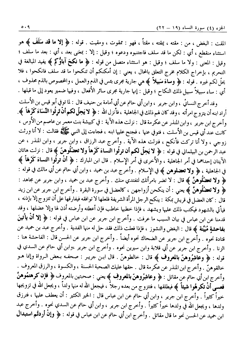 فِي الْجَاهِلِيَّةِ، وَلا تَعْضُلُوهُنَّ فِي الْإِسْلَامِ. وَأَخْرَجَ عَبْدُ بْنُ حُمَيْدٍ، وَابْنُ أَبِي حَاتِمٍ عَنْ أَبِي مَالِكٍ فِي قَوْلِهِ: