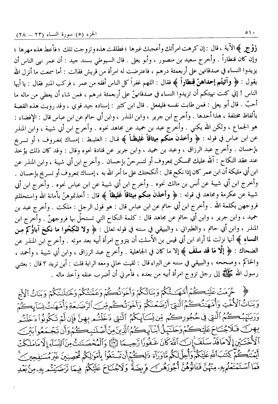 الْآيَةَ، قَالَ: إِنْ كَرِهْتَ امْرَأَتَكَ وَأَعْجَبَكَ غَيْرُهَا فَطَلَّقْتَ هَذِهِ وَتَزَوَّجْتَ تِلْكَ فَأَعْطِ هَذِهِ مَهْرَهَا وَإِنْ كَانَ قِنْطَارًا. وَأَخْرَجَ سَعِيدُ بْنُ مَنْصُورٍ، وَأَبُو يَعْلَى. قَالَ السُّيُوطِيُّ بِسَنَدٍ جَيِّدٍ: أَنَّ عُمَرَ نَهَى النَّاسَ أَنْ يَزِيدُوا النِّسَاءَ فِي صَدَقَاتِهِنَّ عَلَى أَرْبَعِمِائَةِ دِرْهَمٍ، فَاعْتَرَضَتْ لَهُ امْرَأَةٌ مِنْ قُرَيْشٍ فَقَالَتْ: أَمَا سَمِعْتَ مَا أَنْزَلَ اللَّهُ يَقُولُ: وَآتَيْتُمْ إِحْداهُنَّ قِنْطاراً فَقَالَ: اللَّهُمَّ غَفْرًا كُلُّ النَّاسِ أَفْقَهُ مِنْ عُمَرَ، فَرَكِبَ الْمِنْبَرَ فَقَالَ: يَا أَيُّهَا النَّاسُ! إِنِّي كُنْتُ نَهَيْتُكُمْ أَنْ تَزِيدُوا النِّسَاءَ فِي صَدَقَاتِهِنَّ عَلَى أَرْبَعِمِائَةِ دِرْهَمٍ، فَمَنْ شَاءَ أَنْ يُعْطِيَ من ماله ما أحبّ. قال أبو يعلى: فَمَنْ طَابَتْ نَفْسُهُ فَلْيَفْعَلْ. قَالَ ابْنُ كَثِيرٍ: إِسْنَادُهُ جَيِّدٌ قَوِيٌّ، وَقَدْ رُوِيَتْ هَذِهِ الْقِصَّةُ بِأَلْفَاظٍ مُخْتَلِفَةٍ، هَذَا أَحَدُهَا. وَأَخْرَجَ ابْنُ جَرِيرٍ، وَابْنُ الْمُنْذِرِ، وَابْنُ أَبِي حَاتِمٍ عَنِ ابْنِ عَبَّاسٍ قَالَ: الْإِفْضَاءُ: