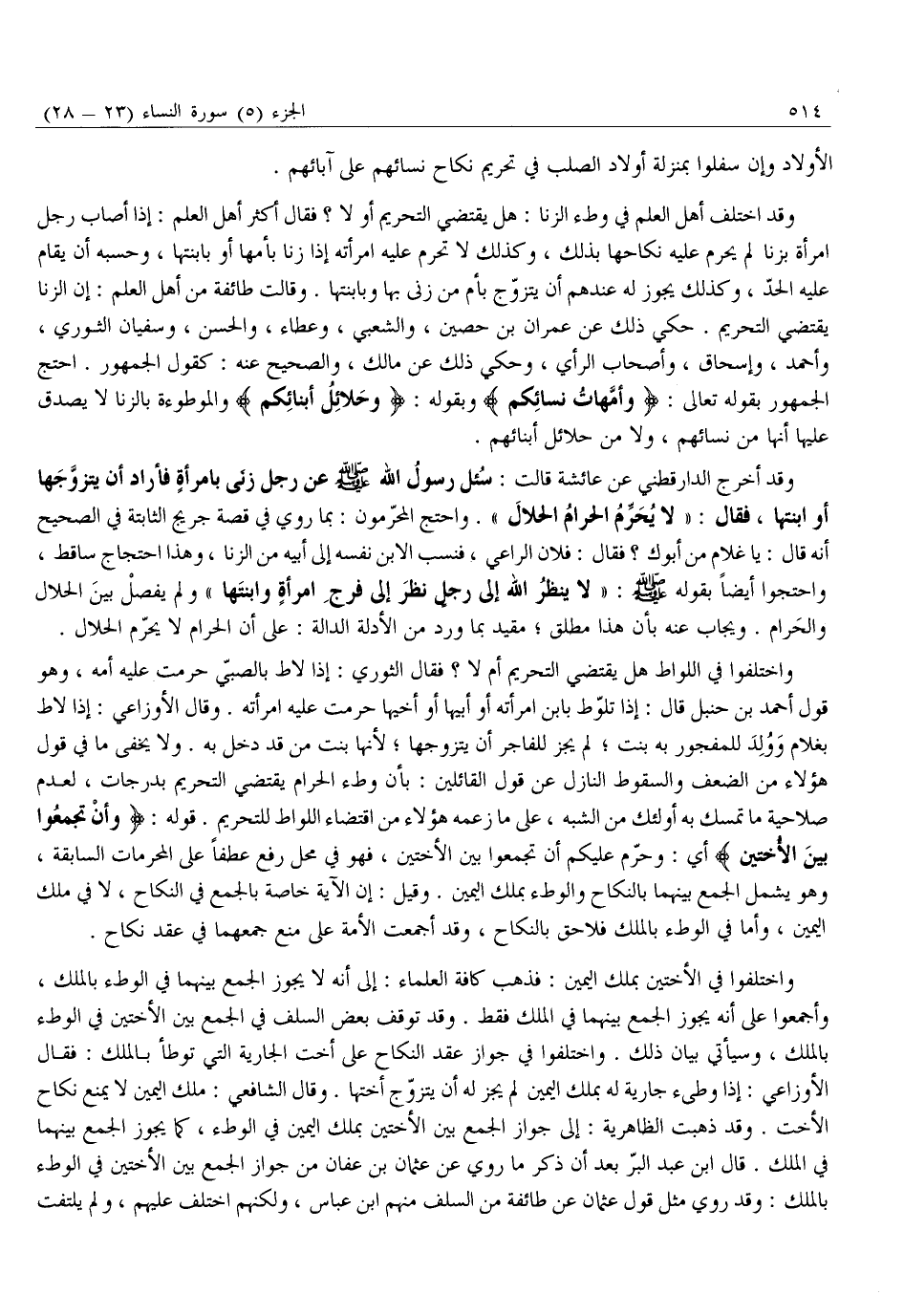 وَقَدِ اخْتَلَفَ أَهْلُ الْعِلْمِ فِي وَطْءِ الزِّنَا: هَلْ يَقْتَضِي التحريم أو لَا؟ فَقَالَ أَكْثَرُ أَهْلِ الْعِلْمِ: إِذَا أَصَابَ رَجُلٌ امْرَأَةً بِزِنًا لَمْ يَحْرُمْ عَلَيْهِ نِكَاحُهَا بِذَلِكَ، وَكَذَلِكَ لَا تَحْرُمُ عَلَيْهِ امْرَأَتُهُ إِذَا زَنَا بِأُمِّهَا أَوْ بِابْنَتِهَا، وَحَسْبُهُ أَنْ يُقَامَ عَلَيْهِ الْحَدُّ، وَكَذَلِكَ يَجُوزُ لَهُ عِنْدَهُمْ أَنْ يَتَزَوَّجَ بِأُمِّ مَنْ زَنَى بِهَا وَبِابْنَتِهَا. وَقَالَتْ طَائِفَةٌ مِنْ أَهْلِ الْعِلْمِ: إِنَّ الزِّنَا يَقْتَضِي التَّحْرِيمَ. حُكِيَ ذَلِكَ عَنْ عِمْرَانَ بْنِ حُصَيْنٍ، وَالشَّعْبِيِّ، وَعَطَاءٍ، وَالْحَسَنِ، وَسُفْيَانَ الثَّوْرِيِّ، وَأَحْمَدَ، وَإِسْحَاقَ، وَأَصْحَابِ الرَّأْيِ، وَحُكِيَ ذَلِكَ عَنْ مَالِكٍ، وَالصَّحِيحُ عَنْهُ: كَقَوْلِ الْجُمْهُورِ. احْتَجَّ الْجُمْهُورُ بِقَوْلِهِ تَعَالَى: وَأُمَّهاتُ نِسائِكُمْ وَبِقَوْلِهِ: وَحَلائِلُ أَبْنائِكُمُ وَالْمَوْطُوءَةُ بِالزِّنَا لَا يَصْدُقُ عَلَيْهَا أَنَّهَا مِنْ نِسَائِهِمْ، وَلَا مِنْ حَلَائِلِ أَبْنَائِهِمْ.