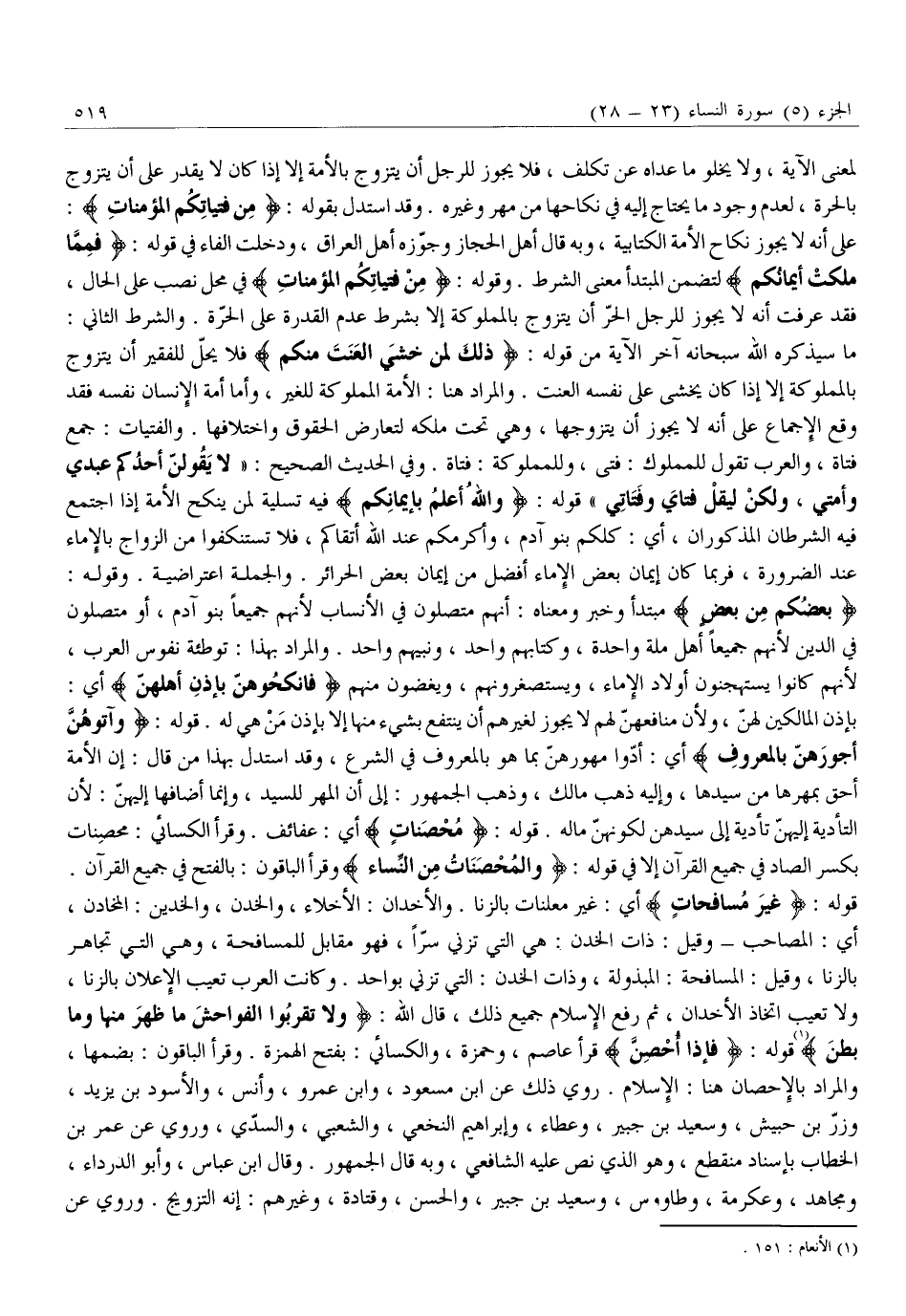 عَلَى أَنَّهُ لَا يَجُوزُ نِكَاحُ الْأَمَةِ الْكِتَابِيَّةِ، وَبِهِ قَالَ أَهْلُ الْحِجَازِ وَجَوَّزَهُ أَهْلُ الْعِرَاقِ، وَدَخَلَتِ الْفَاءُ فِي قَوْلِهِ: فَمِنْ مَا مَلَكَتْ أَيْمانُكُمْ لِتُضَمِّنِ الْمُبْتَدَأَ مَعْنَى الشَّرْطِ. وَقَوْلُهُ: مِنْ فَتَياتِكُمُ الْمُؤْمِناتِ فِي مَحَلِّ نَصْبٍ عَلَى الْحَالِ، فَقَدْ عَرَفْتَ أَنَّهُ لَا يَجُوزُ لِلرَّجُلِ الْحُرِّ أَنْ يَتَزَوَّجَ بِالْمَمْلُوكَةِ إِلَّا بِشَرْطِ عَدَمِ الْقُدْرَةِ عَلَى الْحُرَّةِ. وَالشَّرْطُ الثَّانِي: