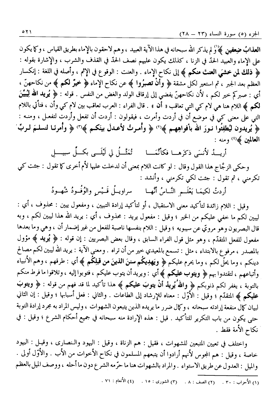 لِيُبَيِّنَ لَكُمْ مَا خَفِيَ عَلَيْكُمْ مِنَ الْخَيْرِ وَقِيلَ: مَفْعُولُ يُرِيدُ: مَحْذُوفٌ، أَيْ: يُرِيدُ اللَّهُ هَذَا لِيُبَيِّنَ لَكُمْ، وَبِهِ قَالَ الْبَصْرِيُّونَ وَهُوَ مَرْوِيٌّ عَنْ سِيبَوَيْهِ وَقِيلَ: اللَّامُ بِنَفْسِهَا نَاصِبَةٌ لِلْفِعْلِ مِنْ غَيْرِ إِضْمَارِ أَنْ، وَهِيَ وَمَا بَعْدَهَا مَفْعُولٌ لِلْفِعْلِ الْمُتَقَدِّمِ، وَهُوَ مِثْلُ قَوْلِ الْفَرَّاءِ السَّابِقِ، وَقَالَ بَعْضُ الْبَصْرِيِّينَ: إن قوله: يُرِيدُ مؤول بِالْمَصْدَرِ، مَرْفُوعٌ بِالِابْتِدَاءِ، مِثْلَ: تَسْمَعُ بِالْمُعَيْدِيِّ خَيْرٌ مِنْ أَنْ تَرَاهُ. وَمَعْنَى الْآيَةِ: يُرِيدُ اللَّهُ لِيُبَيِّنَ لَكُمْ مَصَالِحَ دِينِكُمْ، وَمَا يَحِلُّ لَكُمْ، وَمَا يَحْرُمُ عَلَيْكُمْ وَيَهْدِيَكُمْ سُنَنَ الَّذِينَ مِنْ قَبْلِكُمْ أَيْ: طُرُقَهُمْ، وَهُمُ الْأَنْبِيَاءُ وَأَتْبَاعُهُمْ، لِتَقْتَدُوا بِهِمْ وَيَتُوبَ عَلَيْكُمْ أَيْ: وَيُرِيدُ أَنْ يَتُوبَ عليكم، فتوبوا إليه، وتلاقوا مَا فُرِّطَ مِنْكُمْ بِالتَّوْبَةِ، يَغْفِرْ لَكُمْ ذُنُوبَكُمْ وَاللَّهُ يُرِيدُ أَنْ يَتُوبَ عَلَيْكُمْ هَذَا تَأْكِيدٌ لِمَا قَدْ فُهِمْ مِنْ قَوْلِهِ: وَيَتُوبَ عَلَيْكُمْ الْمُتَقَدِّمِ وَقِيلَ: الْأَوَّلُ: مَعْنَاهُ لِلْإِرْشَادِ إِلَى الطَّاعَاتِ. وَالثَّانِي: فِعْلُ أَسْبَابِهَا وَقِيلَ: إِنَّ الثَّانِيَ لِبَيَانِ كَمَالِ مَنْفَعَةِ إِرَادَتِهِ سُبْحَانَهُ، وَكَمَالِ ضَرَرِ مَا يُرِيدُهُ الَّذِينَ يَتَّبِعُونَ الشَّهَوَاتِ، وَلَيْسَ الْمُرَادُ بِهِ مُجَرَّدَ إِرَادَةِ التَّوْبَةِ حَتَّى يَكُونَ مِنْ بَابِ التَّكْرِيرِ لِلتَّأْكِيدِ. قِيلَ: هَذِهِ الْإِرَادَةُ مِنْهُ سُبْحَانَهُ فِي جَمِيعِ أَحْكَامِ الشَّرْعِ وَقِيلَ: فِي نِكَاحِ الْأَمَةِ فَقَطْ.