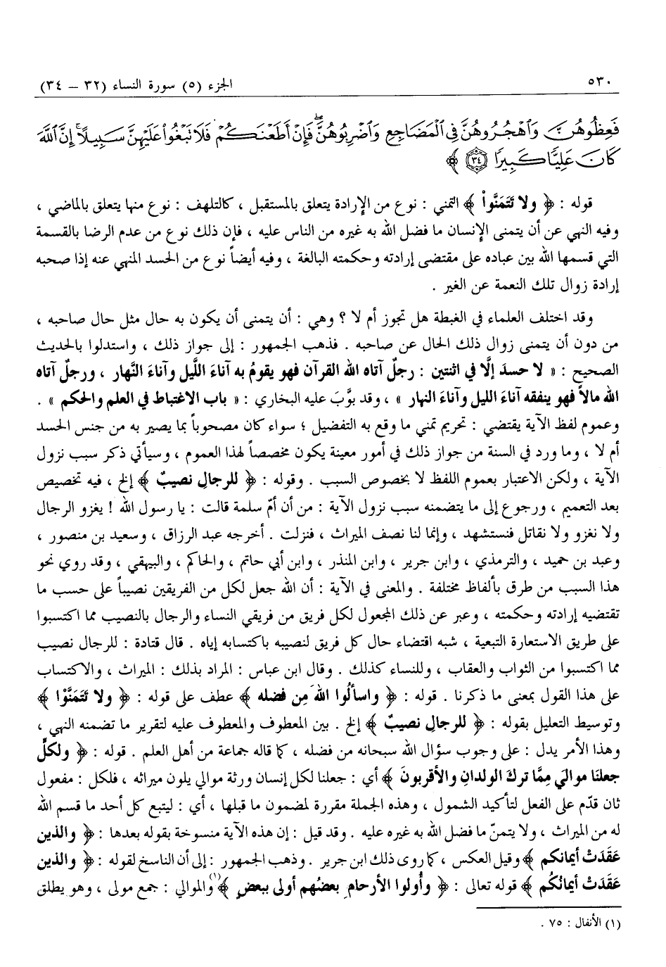 وَلا تَتَمَنَّوْا مَا فَضَّلَ اللَّهُ بِهِ بَعْضَكُمْ عَلى بَعْضٍ لِلرِّجالِ نَصِيبٌ مِمَّا اكْتَسَبُوا وَلِلنِّساءِ نَصِيبٌ مِمَّا اكْتَسَبْنَ وَسْئَلُوا اللَّهَ مِنْ فَضْلِهِ إِنَّ اللَّهَ كانَ بِكُلِّ شَيْءٍ عَلِيماً (32) وَلِكُلٍّ جَعَلْنا مَوالِيَ مِمَّا تَرَكَ الْوالِدانِ وَالْأَقْرَبُونَ وَالَّذِينَ عَقَدَتْ أَيْمانُكُمْ فَآتُوهُمْ نَصِيبَهُمْ إِنَّ اللَّهَ كانَ عَلى كُلِّ شَيْءٍ شَهِيداً (33) الرِّجالُ قَوَّامُونَ عَلَى النِّساءِ بِما فَضَّلَ اللَّهُ بَعْضَهُمْ عَلى بَعْضٍ وَبِما أَنْفَقُوا مِنْ أَمْوالِهِمْ فَالصَّالِحاتُ قانِتاتٌ حافِظاتٌ لِلْغَيْبِ بِما حَفِظَ اللَّهُ وَاللاَّتِي تَخافُونَ نُشُوزَهُنَّ فَعِظُوهُنَّ وَاهْجُرُوهُنَّ فِي الْمَضاجِعِ وَاضْرِبُوهُنَّ فَإِنْ أَطَعْنَكُمْ فَلا تَبْغُوا عَلَيْهِنَّ سَبِيلاً إِنَّ اللَّهَ كانَ عَلِيًّا كَبِيراً (34)