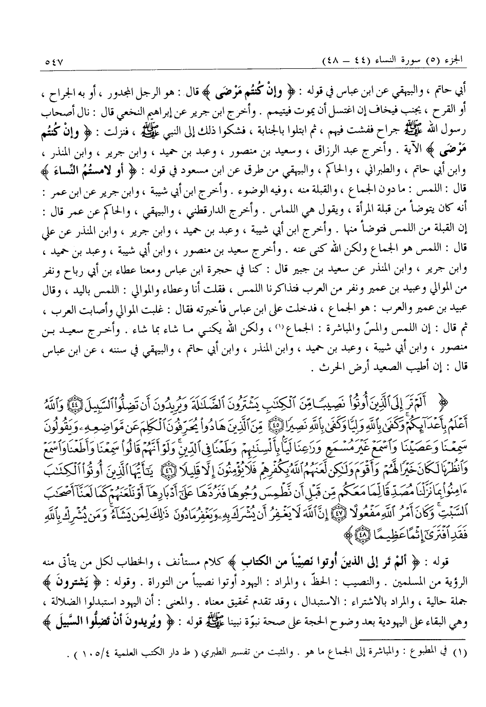 أَلَمْ تَرَ إِلَى الَّذِينَ أُوتُوا نَصِيباً مِنَ الْكِتابِ يَشْتَرُونَ الضَّلالَةَ وَيُرِيدُونَ أَنْ تَضِلُّوا السَّبِيلَ (44) وَاللَّهُ أَعْلَمُ بِأَعْدائِكُمْ وَكَفى بِاللَّهِ وَلِيًّا وَكَفى بِاللَّهِ نَصِيراً (45) مِنَ الَّذِينَ هادُوا يُحَرِّفُونَ الْكَلِمَ عَنْ مَواضِعِهِ وَيَقُولُونَ سَمِعْنا وَعَصَيْنا وَاسْمَعْ غَيْرَ مُسْمَعٍ وَراعِنا لَيًّا بِأَلْسِنَتِهِمْ وَطَعْناً فِي الدِّينِ وَلَوْ أَنَّهُمْ قالُوا سَمِعْنا وَأَطَعْنا وَاسْمَعْ وَانْظُرْنا لَكانَ خَيْراً لَهُمْ وَأَقْوَمَ وَلكِنْ لَعَنَهُمُ اللَّهُ بِكُفْرِهِمْ فَلا يُؤْمِنُونَ إِلاَّ قَلِيلاً (46) يَا أَيُّهَا الَّذِينَ أُوتُوا الْكِتابَ آمِنُوا بِما نَزَّلْنا مُصَدِّقاً لِما مَعَكُمْ مِنْ قَبْلِ أَنْ نَطْمِسَ وُجُوهاً فَنَرُدَّها عَلى أَدْبارِها أَوْ نَلْعَنَهُمْ كَما لَعَنَّا أَصْحابَ السَّبْتِ وَكانَ أَمْرُ اللَّهِ مَفْعُولاً (47) إِنَّ اللَّهَ لَا يَغْفِرُ أَنْ يُشْرَكَ بِهِ وَيَغْفِرُ مَا دُونَ ذلِكَ لِمَنْ يَشاءُ وَمَنْ يُشْرِكْ بِاللَّهِ فَقَدِ افْتَرى إِثْماً عَظِيماً (48)