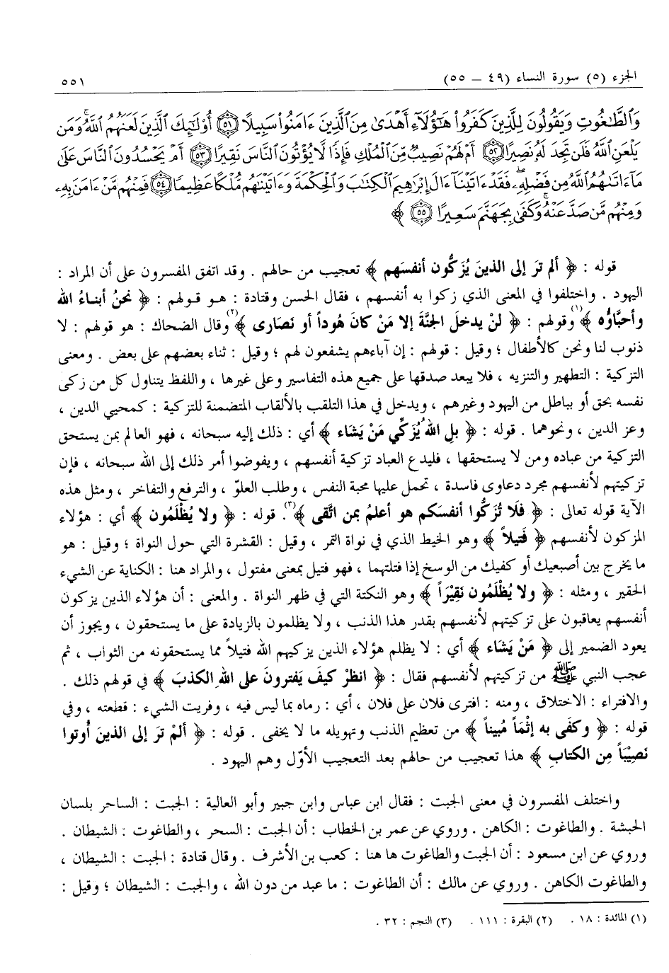 أَلَمْ تَرَ إِلَى الَّذِينَ يُزَكُّونَ أَنْفُسَهُمْ بَلِ اللَّهُ يُزَكِّي مَنْ يَشاءُ وَلا يُظْلَمُونَ فَتِيلاً (49) انْظُرْ كَيْفَ يَفْتَرُونَ عَلَى اللَّهِ الْكَذِبَ وَكَفى بِهِ إِثْماً مُبِيناً (50) أَلَمْ تَرَ إِلَى الَّذِينَ أُوتُوا نَصِيباً مِنَ الْكِتابِ يُؤْمِنُونَ بِالْجِبْتِ وَالطَّاغُوتِ وَيَقُولُونَ لِلَّذِينَ كَفَرُوا هؤُلاءِ أَهْدى مِنَ الَّذِينَ آمَنُوا سَبِيلاً (51) أُولئِكَ الَّذِينَ لَعَنَهُمُ اللَّهُ وَمَنْ يَلْعَنِ اللَّهُ فَلَنْ تَجِدَ لَهُ نَصِيراً (52) أَمْ لَهُمْ نَصِيبٌ مِنَ الْمُلْكِ فَإِذاً لَا يُؤْتُونَ النَّاسَ نَقِيراً (53)
