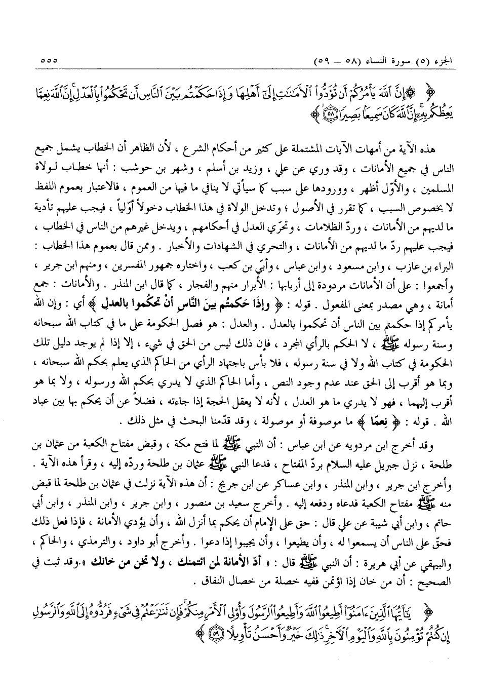الْبَرَاءُ بْنُ عَازِبٍ، وَابْنُ مَسْعُودٍ، وَابْنُ عَبَّاسٍ، وَأُبَيُّ بْنُ كَعْبٍ، وَاخْتَارَهُ جُمْهُورُ الْمُفَسِّرِينَ، وَمِنْهُمُ ابْنُ جَرِيرٍ، وَأَجْمَعُوا: عَلَى أَنَّ الْأَمَانَاتِ مَرْدُودَةٌ إِلَى أَرْبَابِهَا: الْأَبْرَارُ مِنْهُمْ وَالْفُجَّارُ، كَمَا قَالَ ابْنُ الْمُنْذِرِ. وَالْأَمَانَاتُ: جَمْعُ أَمَانَةٍ، وَهِيَ مَصْدَرٌ بِمَعْنَى الْمَفْعُولِ. قَوْلُهُ: وَإِذا حَكَمْتُمْ بَيْنَ النَّاسِ أَنْ تَحْكُمُوا بِالْعَدْلِ أَيْ: وَإِنَّ اللَّهَ يَأْمُرُكُمْ إِذَا حَكَمْتُمْ بَيْنَ النَّاسِ أَنْ تَحْكُمُوا بِالْعَدْلِ. وَالْعَدْلُ: هُوَ فَصْلُ الْحُكُومَةِ عَلَى مَا فِي كِتَابِ اللَّهِ سُبْحَانَهُ وَسُنَّةِ رَسُولِهِ صَلَّى اللَّهُ عَلَيْهِ وَسَلَّمَ، لَا الْحُكْمُ بِالرَّأْيِ الْمُجَرَّدِ، فَإِنَّ ذَلِكَ لَيْسَ مِنَ الْحَقِّ فِي شَيْءٍ، إِلَّا إِذَا لَمْ يُوجَدْ دَلِيلُ تِلْكَ الْحُكُومَةِ فِي كِتَابِ اللَّهِ وَلَا فِي سُنَّةِ رَسُولِهِ، فَلَا بَأْسَ بِاجْتِهَادِ الرَّأْيِ مِنَ الْحَاكِمِ الَّذِي يَعْلَمُ بِحُكْمِ اللَّهِ سُبْحَانَهُ، وَبِمَا هُوَ أَقْرَبُ إِلَى الْحَقِّ عِنْدَ عَدَمِ وُجُودِ النَّصِّ، وَأَمَّا الْحَاكِمُ الَّذِي لَا يَدْرِي بِحُكْمِ اللَّهِ وَرَسُولِهِ، وَلَا بِمَا هُوَ أَقْرَبُ إِلَيْهِمَا، فَهُوَ لَا يَدْرِي مَا هُوَ الْعَدْلُ، لِأَنَّهُ لَا يَعْقِلُ الْحُجَّةَ إِذَا جَاءَتْهُ، فَضْلًا عَنْ أَنْ يَحْكُمَ بِهَا بَيْنَ عِبَادِ اللَّهِ. قَوْلُهُ: نِعِمَّا مَا مَوْصُوفَةٌ أَوْ مَوْصُولَةٌ، وَقَدْ قَدَّمْنَا الْبَحْثَ فِي مِثْلِ ذَلِكَ.