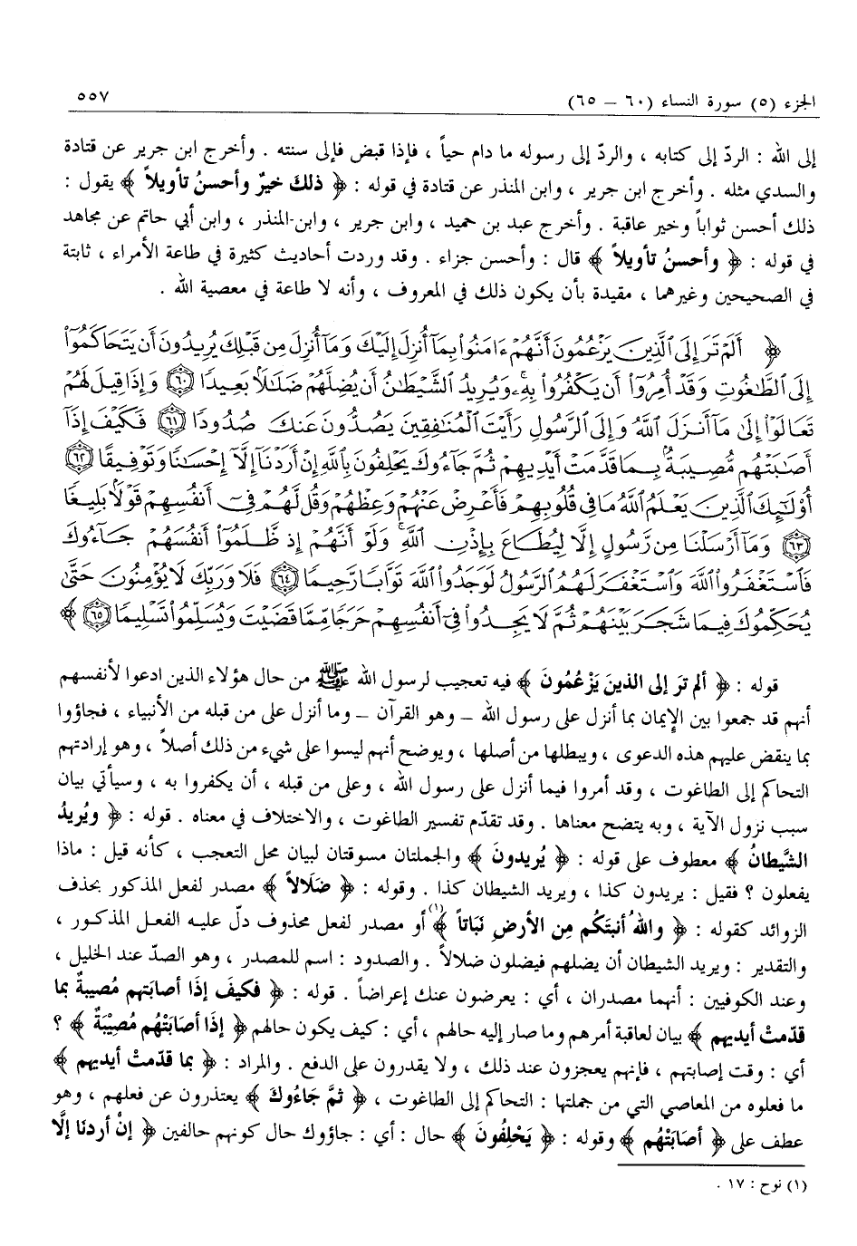 أَلَمْ تَرَ إِلَى الَّذِينَ يَزْعُمُونَ أَنَّهُمْ آمَنُوا بِما أُنْزِلَ إِلَيْكَ وَما أُنْزِلَ مِنْ قَبْلِكَ يُرِيدُونَ أَنْ يَتَحاكَمُوا إِلَى الطَّاغُوتِ وَقَدْ أُمِرُوا أَنْ يَكْفُرُوا بِهِ وَيُرِيدُ الشَّيْطانُ أَنْ يُضِلَّهُمْ ضَلالاً بَعِيداً (60) وَإِذا قِيلَ لَهُمْ تَعالَوْا إِلى مَا أَنْزَلَ اللَّهُ وَإِلَى الرَّسُولِ رَأَيْتَ الْمُنافِقِينَ يَصُدُّونَ عَنْكَ صُدُوداً (61) فَكَيْفَ إِذا أَصابَتْهُمْ مُصِيبَةٌ بِما قَدَّمَتْ أَيْدِيهِمْ ثُمَّ جاؤُكَ يَحْلِفُونَ بِاللَّهِ إِنْ أَرَدْنا إِلاَّ إِحْساناً وَتَوْفِيقاً (62) أُولئِكَ الَّذِينَ يَعْلَمُ اللَّهُ مَا فِي قُلُوبِهِمْ فَأَعْرِضْ عَنْهُمْ وَعِظْهُمْ وَقُلْ لَهُمْ فِي أَنْفُسِهِمْ قَوْلاً بَلِيغاً (63) وَما أَرْسَلْنا مِنْ رَسُولٍ إِلاَّ لِيُطاعَ بِإِذْنِ اللَّهِ وَلَوْ أَنَّهُمْ إِذْ ظَلَمُوا أَنْفُسَهُمْ جاؤُكَ فَاسْتَغْفَرُوا اللَّهَ وَاسْتَغْفَرَ لَهُمُ الرَّسُولُ لَوَجَدُوا اللَّهَ تَوَّاباً رَحِيماً (64)