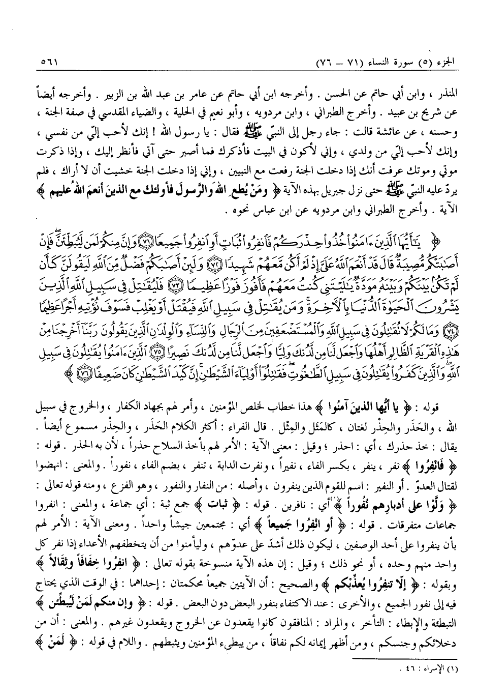 يَا أَيُّهَا الَّذِينَ آمَنُوا خُذُوا حِذْرَكُمْ فَانْفِرُوا ثُباتٍ أَوِ انْفِرُوا جَمِيعاً (71) وَإِنَّ مِنْكُمْ لَمَنْ لَيُبَطِّئَنَّ فَإِنْ أَصابَتْكُمْ مُصِيبَةٌ قالَ قَدْ أَنْعَمَ اللَّهُ عَلَيَّ إِذْ لَمْ أَكُنْ مَعَهُمْ شَهِيداً (72) وَلَئِنْ أَصابَكُمْ فَضْلٌ مِنَ اللَّهِ لَيَقُولَنَّ كَأَنْ لَمْ تَكُنْ بَيْنَكُمْ وَبَيْنَهُ مَوَدَّةٌ يَا لَيْتَنِي كُنْتُ مَعَهُمْ فَأَفُوزَ فَوْزاً عَظِيماً (73) فَلْيُقاتِلْ فِي سَبِيلِ اللَّهِ الَّذِينَ يَشْرُونَ الْحَياةَ الدُّنْيا بِالْآخِرَةِ وَمَنْ يُقاتِلْ فِي سَبِيلِ اللَّهِ فَيُقْتَلْ أَوْ يَغْلِبْ فَسَوْفَ نُؤْتِيهِ أَجْراً عَظِيماً (74) وَما لَكُمْ لَا تُقاتِلُونَ فِي سَبِيلِ اللَّهِ وَالْمُسْتَضْعَفِينَ مِنَ الرِّجالِ وَالنِّساءِ وَالْوِلْدانِ الَّذِينَ يَقُولُونَ رَبَّنا أَخْرِجْنا مِنْ هذِهِ الْقَرْيَةِ الظَّالِمِ أَهْلُها وَاجْعَلْ لَنا مِنْ لَدُنْكَ وَلِيًّا وَاجْعَلْ لَنا مِنْ لَدُنْكَ نَصِيراً (75)