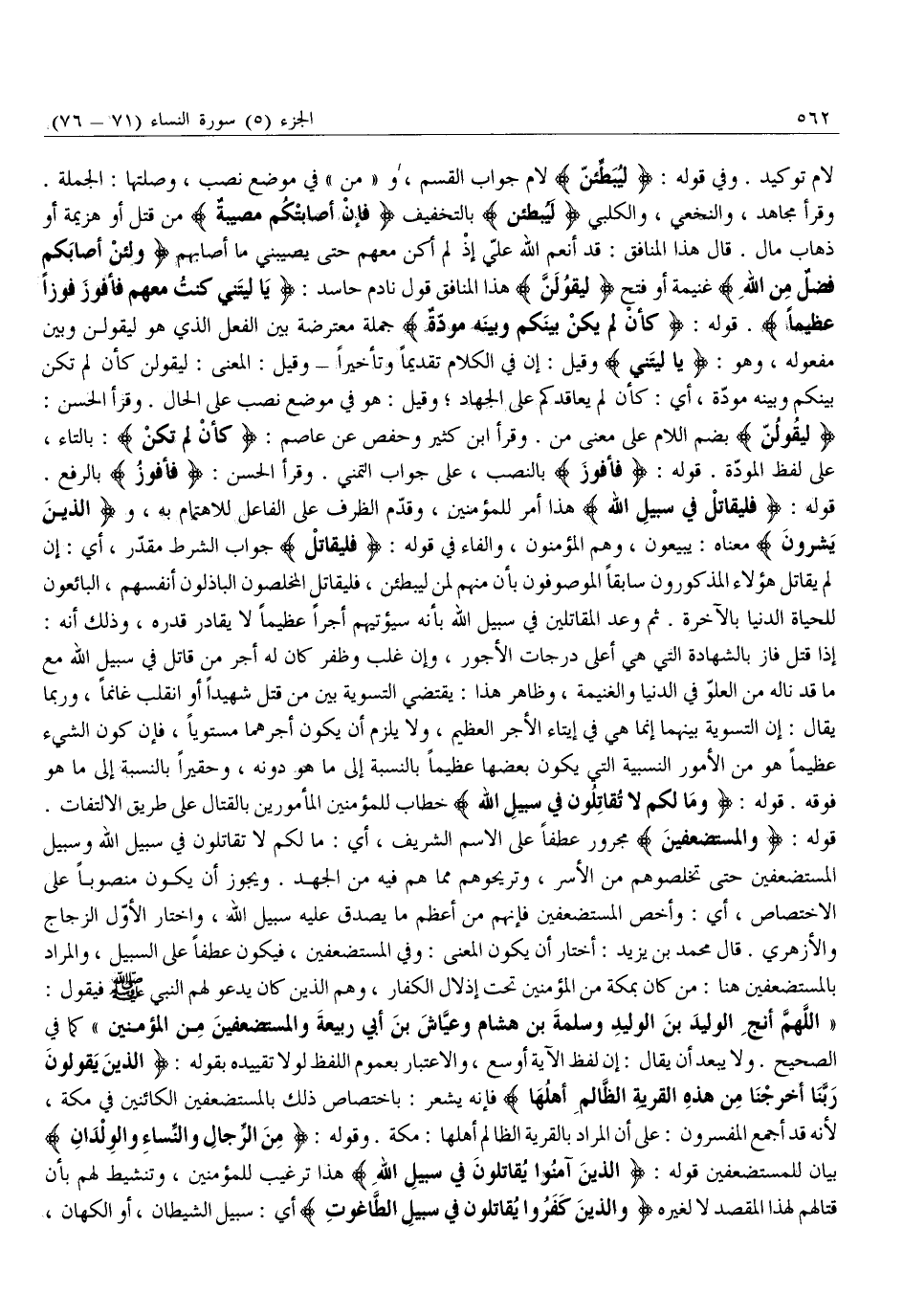 «اللَّهُمَّ أَنْجِ الْوَلِيدَ بْنَ الْوَلِيدِ وَسَلَمَةَ بْنَ هِشَامٍ وَعَيَّاشَ بْنَ أَبِي رَبِيعَةَ وَالْمُسْتَضْعَفِينَ مِنَ الْمُؤْمِنِينَ» كَمَا فِي الصَّحِيحِ. وَلَا يَبْعُدُ أَنْ يُقَالَ: إِنَّ لَفْظَ الْآيَةِ أَوْسَعُ، وَالِاعْتِبَارُ بِعُمُومِ اللَّفْظِ لَوْلَا تَقْيِيدُهُ بِقَوْلِهِ: الَّذِينَ يَقُولُونَ رَبَّنا أَخْرِجْنا مِنْ هذِهِ الْقَرْيَةِ الظَّالِمِ أَهْلُها فَإِنَّهُ يُشْعِرُ: بِاخْتِصَاصِ ذَلِكَ بِالْمُسْتَضْعَفِينَ الْكَائِنِينَ فِي مَكَّةَ، لِأَنَّهُ قَدْ أَجْمَعَ الْمُفَسِّرُونَ: عَلَى أَنَّ الْمُرَادَ بِالْقَرْيَةِ الظَّالِمِ أَهْلُهَا: مَكَّةُ. وَقَوْلُهُ: مِنَ الرِّجالِ وَالنِّساءِ وَالْوِلْدانِ بَيَانٌ لِلْمُسْتَضْعَفِينَ قَوْلُهُ: الَّذِينَ آمَنُوا يُقاتِلُونَ فِي سَبِيلِ اللَّهِ هَذَا تَرْغِيبٌ لِلْمُؤْمِنِينَ، وَتَنْشِيطٌ لَهُمْ بِأَنَّ قِتَالَهُمْ لِهَذَا الْمَقْصِدِ لَا لِغَيْرِهِ وَالَّذِينَ كَفَرُوا يُقاتِلُونَ فِي سَبِيلِ الطَّاغُوتِ أَيْ: سَبِيلِ الشَّيْطَانِ، أَوِ الْكُهَّانِ،