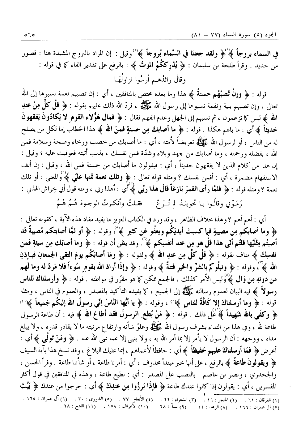 وَما أَصابَكُمْ مِنْ مُصِيبَةٍ فَبِما كَسَبَتْ أَيْدِيكُمْ وَيَعْفُوا عَنْ كَثِيرٍ «5» ، وَقَوْلِهِ: أَوَلَمَّا أَصابَتْكُمْ مُصِيبَةٌ قَدْ أَصَبْتُمْ مِثْلَيْها قُلْتُمْ أَنَّى هَذَا قُلْ هُوَ مِنْ عِنْدِ أَنْفُسِكُمْ «6» . وَقَدْ يُظَنُّ أَنَّ قَوْلَهُ: وَما أَصابَكَ مِنْ سَيِّئَةٍ فَمِنْ نَفْسِكَ مُنَافٍ لِقَوْلِهِ: قُلْ كُلٌّ مِنْ عِنْدِ اللَّهِ وَلِقَوْلِهِ: وَما أَصابَكُمْ يَوْمَ الْتَقَى الْجَمْعانِ فَبِإِذْنِ اللَّهِ «7» ، وقوله: وَنَبْلُوكُمْ بِالشَّرِّ وَالْخَيْرِ فِتْنَةً وَقَوْلِهِ: وَإِذا أَرادَ اللَّهُ بِقَوْمٍ سُوْءاً فَلا مَرَدَّ لَهُ وَما لَهُمْ مِنْ دُونِهِ مِنْ والٍ «8» وَلَيْسَ الْأَمْرُ كَذَلِكَ، فَالْجَمْعُ مُمْكِنٌ كَمَا هُوَ مُقَرَّرٌ فِي مَوَاطِنِهِ. قَوْلُهُ: وَأَرْسَلْناكَ لِلنَّاسِ رَسُولًا فِيهِ الْبَيَانُ لِعُمُومِ رِسَالَتِهِ صَلَّى اللَّهُ عَلَيْهِ وَسَلَّمَ إِلَى الْجَمِيعِ، كَمَا يُفِيدُهُ التَّأْكِيدُ بِالْمَصْدَرِ، وَالْعُمُومِ فِي النَّاسِ، وَمِثْلُهُ قَوْلُهُ: وَما أَرْسَلْناكَ إِلَّا كَافَّةً لِلنَّاسِ «9» ، وقوله: يَا أَيُّهَا النَّاسُ إِنِّي رَسُولُ اللَّهِ إِلَيْكُمْ جَمِيعاً «10» وَكَفى بِاللَّهِ شَهِيداً «11» عَلَى ذَلِكَ. قَوْلُهُ: مَنْ يُطِعِ الرَّسُولَ فَقَدْ أَطاعَ اللَّهَ فِيهِ: أَنَّ طَاعَةَ الرَّسُولِ طَاعَةٌ لِلَّهِ، وَفِي هَذَا مِنَ النِّدَاءِ بِشَرَفِ رَسُولِ الله صلّى الله عليه وَسَلَّمَ وَعُلُوِّ شَانِهِ وَارْتِفَاعِ مَرْتَبَتِهِ مَا لَا يُقَادَرُ قَدْرُهُ، وَلَا يُبْلَغُ مَدَاهُ، وَوَجْهُهُ: أَنَّ الرَّسُولَ لَا يَأْمُرُ إِلَّا بِمَا أَمَرَ اللَّهُ بِهِ، وَلَا يَنْهَى إِلَّا عَمَّا نَهَى اللَّهُ عَنْهُ. وَمَنْ تَوَلَّى أَيْ: