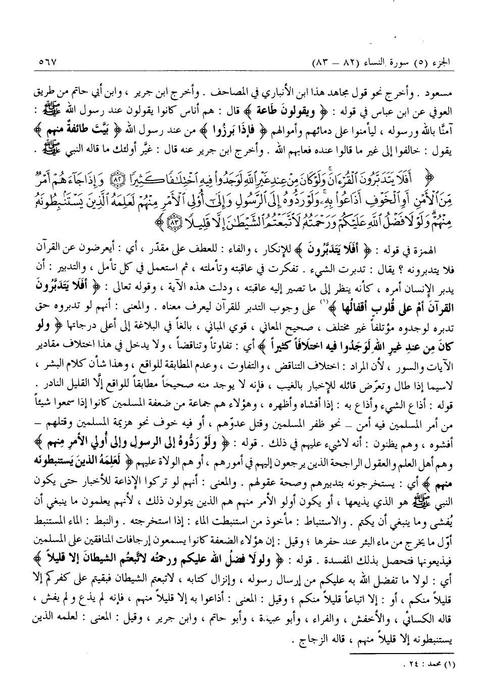 أَفَلا يَتَدَبَّرُونَ الْقُرْآنَ وَلَوْ كانَ مِنْ عِنْدِ غَيْرِ اللَّهِ لَوَجَدُوا فِيهِ اخْتِلافاً كَثِيراً (82) وَإِذا جاءَهُمْ أَمْرٌ مِنَ الْأَمْنِ أَوِ الْخَوْفِ أَذاعُوا بِهِ وَلَوْ رَدُّوهُ إِلَى الرَّسُولِ وَإِلى أُولِي الْأَمْرِ مِنْهُمْ لَعَلِمَهُ الَّذِينَ يَسْتَنْبِطُونَهُ مِنْهُمْ وَلَوْلا فَضْلُ اللَّهِ عَلَيْكُمْ وَرَحْمَتُهُ لاتَّبَعْتُمُ الشَّيْطانَ إِلاَّ قَلِيلاً (83)