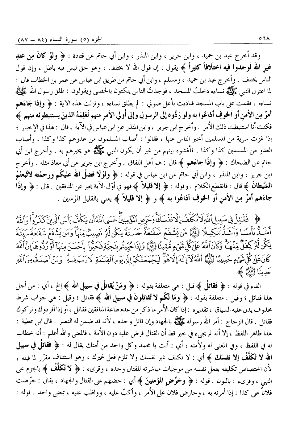 فَقاتِلْ فِي سَبِيلِ اللَّهِ لَا تُكَلَّفُ إِلاَّ نَفْسَكَ وَحَرِّضِ الْمُؤْمِنِينَ عَسَى اللَّهُ أَنْ يَكُفَّ بَأْسَ الَّذِينَ كَفَرُوا وَاللَّهُ أَشَدُّ بَأْساً وَأَشَدُّ تَنْكِيلاً (84) مَنْ يَشْفَعْ شَفاعَةً حَسَنَةً يَكُنْ لَهُ نَصِيبٌ مِنْها وَمَنْ يَشْفَعْ شَفاعَةً سَيِّئَةً يَكُنْ لَهُ كِفْلٌ مِنْها وَكانَ اللَّهُ عَلى كُلِّ شَيْءٍ مُقِيتاً (85) وَإِذا حُيِّيتُمْ بِتَحِيَّةٍ فَحَيُّوا بِأَحْسَنَ مِنْها أَوْ رُدُّوها إِنَّ اللَّهَ كانَ عَلى كُلِّ شَيْءٍ حَسِيباً (86) اللَّهُ لَا إِلهَ إِلاَّ هُوَ لَيَجْمَعَنَّكُمْ إِلى يَوْمِ الْقِيامَةِ لَا رَيْبَ فِيهِ وَمَنْ أَصْدَقُ مِنَ اللَّهِ حَدِيثاً (87)