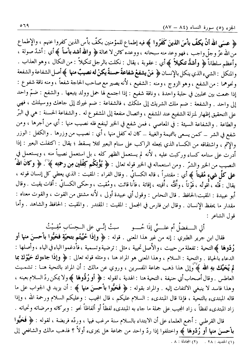 إِذَا جَمَعَتْ بَيْنَ مِحْلَبَيْنِ فِي حَلْبَةٍ وَاحِدَةٍ، وَنَاقَةٌ شَفِيعٌ: إِذَا اجْتَمَعَ لَهَا حَمْلٌ وَوَلَدٌ يَتْبَعُهَا. وَالشَّفْعُ: ضَمُّ وَاحِدٍ إِلَى وَاحِدٍ. وَالشُّفْعَةُ: ضَمُّ مِلْكِ الشَّرِيكِ إلى ملكك، فَالشَّفَاعَةُ: ضَمُّ غَيْرِكَ إِلَى جَاهِكَ وَوَسِيلَتِكَ، فَهِيَ عَلَى التَّحْقِيقِ إِظْهَارٌ لِمَنْزِلَةِ الشَّفِيعِ عِنْدَ الْمُشَفَّعِ، وَاتِّصَالُ مَنْفَعَةٍ إِلَى الْمَشْفُوعِ لَهُ. وَالشَّفَاعَةُ الْحَسَنَةُ: هِيَ فِي الْبِرِّ وَالطَّاعَةِ. وَالشَّفَاعَةُ السَّيِّئَةُ: فِي الْمَعَاصِي، فَمَنْ شَفَعَ فِي الْخَيْرِ لِيَنْفَعَ فَلَهُ نَصِيبٌ مِنْهَا: أَيْ مِنْ أَجْرِهَا، وَمَنْ شَفَعَ فِي الشَّرِّ- كَمَنْ يَسْعَى بِالنَّمِيمَةِ وَالْغِيبَةِ- كَانَ لَهُ كِفْلٌ مِنْهَا، أَيْ: نَصِيبٌ مِنْ وِزْرِهَا. وَالْكِفْلُ: الْوِزْرُ وَالْإِثْمُ، وَاشْتِقَاقُهُ مِنَ الْكِسَاءِ الَّذِي يَجْعَلُهُ الرَّاكِبُ عَلَى سَنَامِ الْبَعِيرِ لِئَلَّا يَسْقُطَ يقال: اكتفلت البعير: إذا أدرت عَلَى سَنَامِهِ كِسَاءً وَرَكِبْتَ عَلَيْهِ، لِأَنَّهُ لَمْ يَسْتَعْمِلِ الظَّهْرَ كُلَّهُ، بَلِ اسْتَعْمَلَ نَصِيبًا مِنْهُ، وَيُسْتَعْمَلُ فِي النَّصِيبِ مِنَ الْخَيْرِ وَالشَّرِّ. وَمِنِ اسْتِعْمَالِهِ فِي الْخَيْرِ قَوْلُهُ تَعَالَى: يُؤْتِكُمْ كِفْلَيْنِ مِنْ رَحْمَتِهِ «1» . وَكانَ اللَّهُ عَلى كُلِّ شَيْءٍ مُقِيتاً أَيْ: مُقْتَدِرًا، قَالَهُ الْكِسَائِيُّ. وَقَالَ الْفَرَّاءُ: الْمَقِيتُ: الَّذِي يُعْطِي كُلَّ إِنْسَانٍ قُوتَهُ، يُقَالُ: قُتُّهُ، أَقُوتُهُ، قُوتًا، وَأَقَتُّهُ، أُقِيتُهُ، إِقَاتَةً، فَأَنَا قَائِتٌ، وَمُقِيتٌ، وَحَكَى الْكِسَائِيُّ: أَقَاتَ يُقِيتُ. وَقَالَ أَبُو عُبَيْدَةَ: الْمُقِيتُ: الْحَافِظُ. قَالَ النَّحَّاسُ: وَقَوْلُ أَبِي عُبَيْدَةَ أَوْلَى، لِأَنَّهُ مُشْتَقٌّ مِنَ الْقُوتِ، وَالْقُوتُ مَعْنَاهُ: