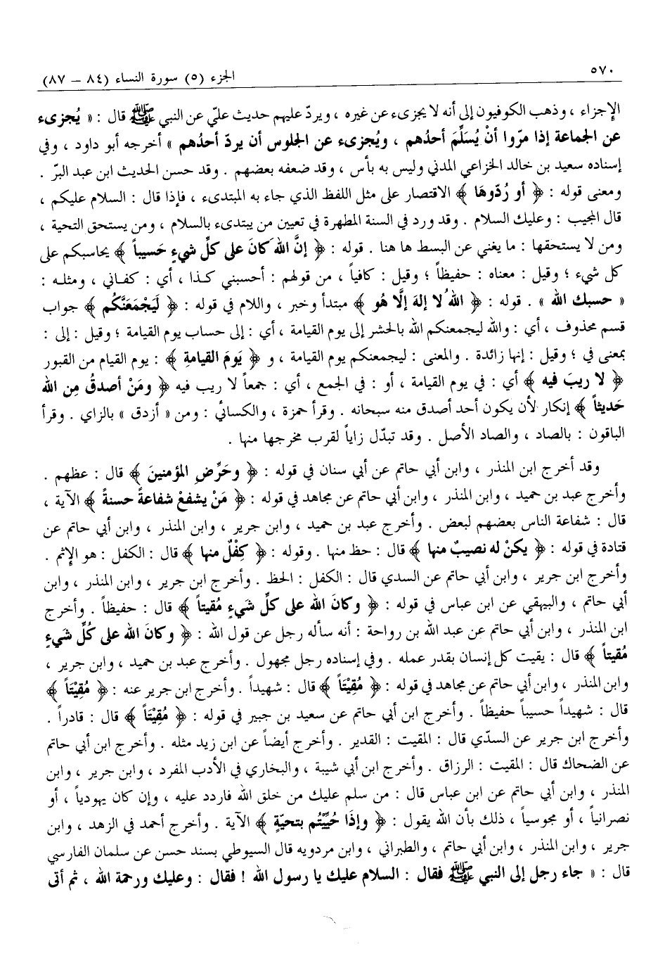 وَأَخْرَجَ ابْنُ جَرِيرٍ عَنِ السُّدِّيِّ قَالَ: الْمَقِيتُ: الْقَدِيرُ. وَأَخْرَجَ أَيْضًا عَنِ ابْنِ زَيْدٍ مِثْلَهُ. وَأَخْرَجَ ابْنُ أَبِي حَاتِمٍ عَنِ الضَّحَّاكِ قَالَ: الْمُقِيتُ: الرَّزَّاقُ. وَأَخْرَجَ ابْنُ أَبِي شَيْبَةَ، وَالْبُخَارِيُّ فِي الْأَدَبِ الْمُفْرَدِ، وَابْنُ جَرِيرٍ، وَابْنُ الْمُنْذِرِ، وَابْنُ أَبِي حَاتِمٍ عَنِ ابْنِ عَبَّاسٍ قَالَ: مَنْ سَلَّمَ عَلَيْكَ مِنْ خَلْقِ اللَّهِ فَارْدُدْ عَلَيْهِ، وَإِنْ كَانَ يَهُودِيًّا، أَوْ نَصْرَانِيًّا، أَوْ مَجُوسِيًّا، ذَلِكَ بِأَنَّ اللَّهَ يَقُولُ: وَإِذا حُيِّيتُمْ بِتَحِيَّةٍ الْآيَةَ. وَأَخْرَجَ أَحْمَدُ فِي الزُّهْدِ، وَابْنُ جَرِيرٍ، وَابْنُ الْمُنْذِرِ، وَابْنُ أَبِي حَاتِمٍ، وَالطَّبَرَانِيُّ، وَابْنُ مَرْدَوَيْهِ قَالَ السُّيُوطِيُّ بِسَنَدٍ حَسَنٍ عَنْ سَلْمَانَ الْفَارِسِيِّ قَالَ: «جَاءَ رَجُلٌ إِلَى النَّبِيِّ صَلَّى اللَّهُ عَلَيْهِ وَسَلَّمَ فَقَالَ: السَّلَامُ عَلَيْكَ يَا رَسُولَ اللَّهِ! فَقَالَ: وَعَلَيْكَ وَرَحْمَةُ اللَّهِ، ثُمَّ أَتَى