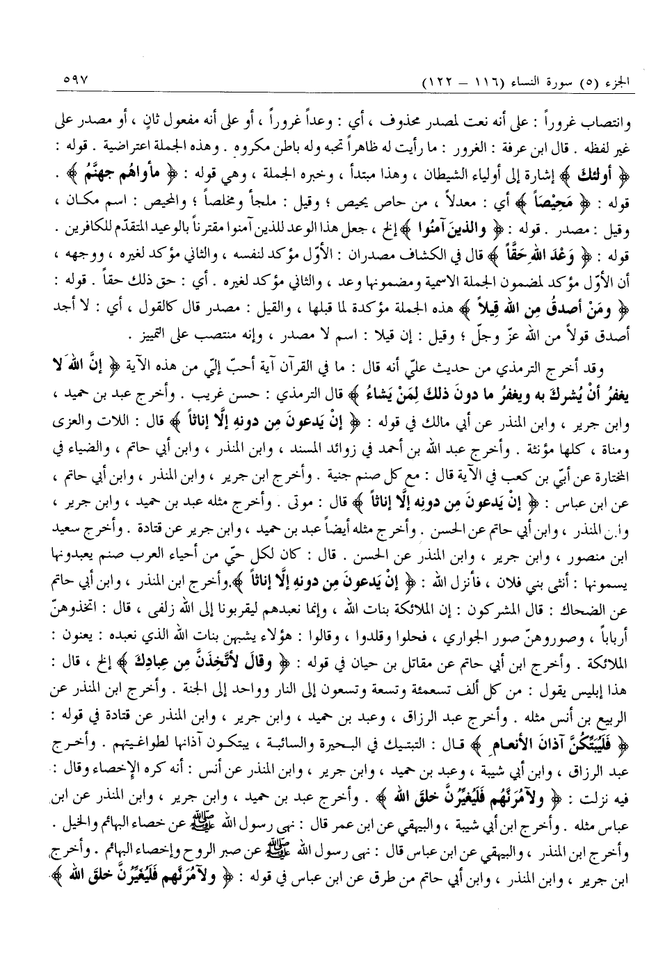 وَقَدْ أَخْرَجَ التِّرْمِذِيُّ مِنْ حَدِيثِ عَلِيٍّ أَنَّهُ قَالَ: مَا فِي الْقُرْآنِ آيَةٌ أَحَبُّ إِلَيَّ مِنْ هَذِهِ الْآيَةِ إِنَّ اللَّهَ لَا يَغْفِرُ أَنْ يُشْرَكَ بِهِ وَيَغْفِرُ مَا دُونَ ذلِكَ لِمَنْ يَشاءُ قَالَ التِّرْمِذِيُّ: حَسَنٌ غَرِيبٌ. وَأَخْرَجَ عَبْدُ بْنُ حُمَيْدٍ، وَابْنُ جَرِيرٍ، وَابْنُ الْمُنْذِرِ عَنْ أَبِي مَالِكٍ فِي قَوْلِهِ: إِنْ يَدْعُونَ مِنْ دُونِهِ إِلَّا إِناثاً قَالَ: اللَّاتُ والعزى وَمَنَاةُ، كُلُّهَا مُؤَنَّثَةٌ. وَأَخْرَجَ عَبْدُ اللَّهِ بْنُ أَحْمَدَ فِي زَوَائِدِ الْمُسْنَدِ، وَابْنُ الْمُنْذِرِ، وَابْنُ أَبِي حَاتِمٍ، وَالضِّيَاءُ فِي الْمُخْتَارَةِ عَنْ أُبَيِّ بْنِ كَعْبٍ فِي الْآيَةِ قَالَ: مَعَ كُلِّ صَنَمٍ جِنِّيَّةٌ. وَأَخْرَجَ ابْنُ جَرِيرٍ، وَابْنُ الْمُنْذِرِ، وَابْنُ أَبِي حاتم، عن ابن عباس: إِنْ يَدْعُونَ مِنْ دُونِهِ إِلَّا إِناثاً قَالَ: مَوْتًى. وَأَخْرَجَ مِثْلَهُ عَبْدُ بْنُ حُمَيْدٍ، وَابْنُ جَرِيرٍ، وَابْنُ الْمُنْذِرِ، وَابْنُ أَبِي حَاتِمٍ عَنِ الْحَسَنِ. وَأَخْرَجَ مِثْلَهُ أَيْضًا عَبْدُ بْنُ حُمَيْدٍ، وَابْنُ جَرِيرٍ عَنْ قَتَادَةَ. وأخرج سعيد ابن مَنْصُورٍ، وَابْنُ جَرِيرٍ، وَابْنُ الْمُنْذِرِ عَنِ الْحَسَنِ. قَالَ: كَانَ لِكُلِّ حَيٍّ مِنْ أَحْيَاءِ الْعَرَبِ صَنَمٌ يَعْبُدُونَهَا يُسَمُّونَهَا: أُنْثَى بَنِي فُلَانٍ، فَأَنْزَلَ اللَّهُ: إِنْ يَدْعُونَ مِنْ دُونِهِ إِلَّا إِناثاً. وَأَخْرَجَ ابْنُ الْمُنْذِرِ، وَابْنُ أَبِي حَاتِمٍ عَنِ الضَّحَّاكِ: قَالَ الْمُشْرِكُونَ: إِنَّ الْمَلَائِكَةَ بَنَاتُ اللَّهِ، وَإِنَّمَا نَعْبُدُهُمْ لِيُقَرِّبُونَا إِلَى اللَّهِ زُلْفَى، قَالَ: اتَّخَذُوهُنَّ أَرْبَابًا، وَصَوَّرُوهُنَّ صُوَرَ الْجَوَارِي، فَحَلُّوا وَقَلَّدُوا، وَقَالُوا: هَؤُلَاءِ يُشْبِهْنَ بَنَاتَ اللَّهِ الَّذِي نَعْبُدُهُ: يَعْنُونَ: