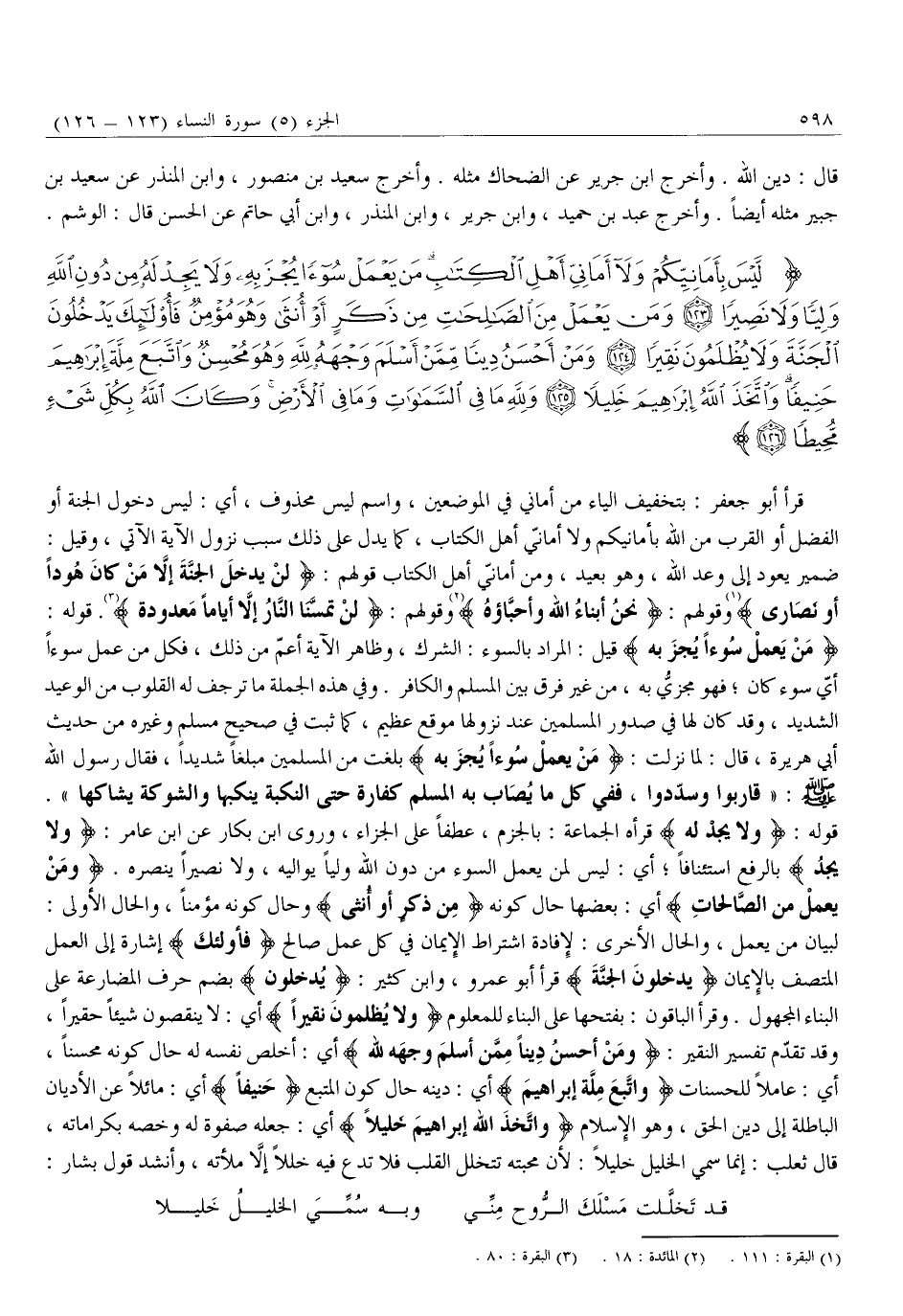 لَيْسَ بِأَمانِيِّكُمْ وَلا أَمانِيِّ أَهْلِ الْكِتابِ مَنْ يَعْمَلْ سُوءاً يُجْزَ بِهِ وَلا يَجِدْ لَهُ مِنْ دُونِ اللَّهِ وَلِيًّا وَلا نَصِيراً (123) وَمَنْ يَعْمَلْ مِنَ الصَّالِحاتِ مِنْ ذَكَرٍ أَوْ أُنْثى وَهُوَ مُؤْمِنٌ فَأُولئِكَ يَدْخُلُونَ الْجَنَّةَ وَلا يُظْلَمُونَ نَقِيراً (124) وَمَنْ أَحْسَنُ دِيناً مِمَّنْ أَسْلَمَ وَجْهَهُ لِلَّهِ وَهُوَ مُحْسِنٌ وَاتَّبَعَ مِلَّةَ إِبْراهِيمَ حَنِيفاً وَاتَّخَذَ اللَّهُ إِبْراهِيمَ خَلِيلاً (125) وَلِلَّهِ مَا فِي السَّماواتِ وَما فِي الْأَرْضِ وَكانَ اللَّهُ بِكُلِّ شَيْءٍ مُحِيطاً (126)