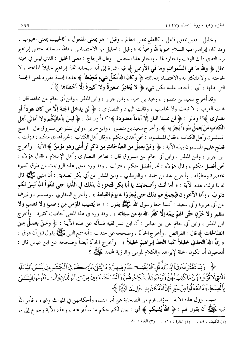 وَخَلِيلٌ: فَعِيلٌ بِمَعْنَى فَاعِلٍ، كَالْعَلِيمِ بِمَعْنَى الْعَالِمِ، وَقِيلَ: هُوَ بِمَعْنَى الْمَفْعُولِ، كَالْحَبِيبِ بِمَعْنَى الْمَحْبُوبِ، وَقَدْ كَانَ إِبْرَاهِيمُ عَلَيْهِ السَّلَامُ مَحْبُوبًا لِلَّهِ وَمُحِبًّا لَهُ وَقِيلَ: الْخَلِيلُ مِنَ الِاخْتِصَاصِ، فَاللَّهُ سُبْحَانَهُ اخْتَصَّ إِبْرَاهِيمَ بِرِسَالَتِهِ فِي ذَلِكَ الْوَقْتِ وَاخْتَارَهُ لَهَا، وَاخْتَارَ هَذَا النَّحَّاسُ. وَقَالَ الزَّجَّاجُ: مَعْنَى الْخَلِيلِ: الَّذِي لَيْسَ فِي مَحَبَّتِهِ خَلَلٌ وَلِلَّهِ مَا فِي السَّماواتِ وَما فِي الْأَرْضِ فِيهِ إِشَارَةٌ إِلَى أَنَّهُ سُبْحَانَهُ اتَّخَذَ إِبْرَاهِيمَ خَلِيلًا لِطَاعَتِهِ، لَا لِحَاجَتِهِ، وَلَا لِلتَّكَثُّرِ بِهِ وَالِاعْتِضَادِ بِمُخَالَلَتِهِ وَكانَ اللَّهُ بِكُلِّ شَيْءٍ مُحِيطاً هَذِهِ الْجُمْلَةُ مُقَرِّرَةٌ لِمَعْنَى الْجُمْلَةِ الَّتِي قَبْلَهَا، أَيْ: أَحَاطَ عِلْمُهُ بِكُلِّ شَيْءٍ لَا يُغادِرُ صَغِيرَةً وَلا كَبِيرَةً إِلَّا أَحْصاها «1» .