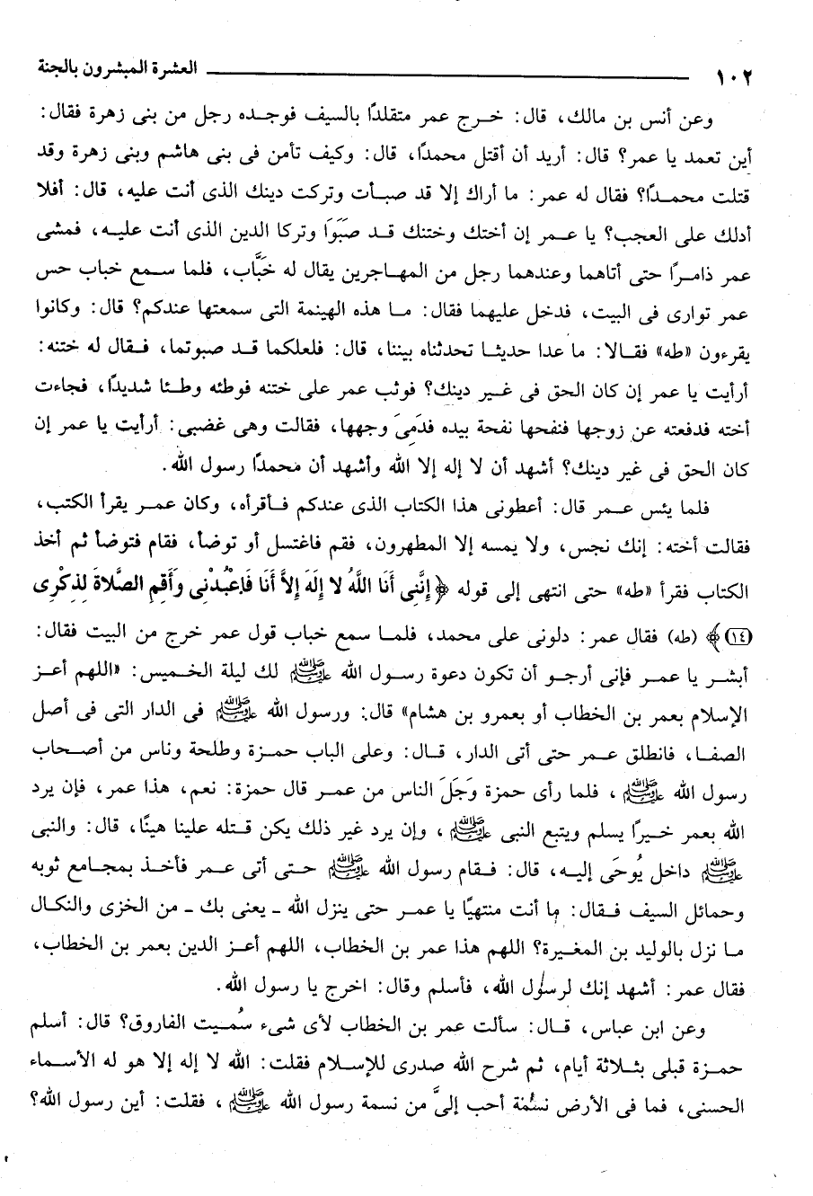 وعن أنس بن مالك قال خرج عمر متقلدا السيف فوجده رجل من بني زهرة فقال أين تعمد يا عمر قال أريد أن اقتل محمدا قال وكيف تأمن في بني هاشم وبني زهرة وقد قتلت محمداً فقال له عمر ما أراك إلا قد صبأت وتركت دينك الذي أنت عليه قال أفلا أدلك على العجب يا عمر إن أختك وختنك قد صبوا وتركا دينك الذي أنت عليه فمشى عمر ذامرا حتى أتاهما وعندهما رجل من المهاجرين يقال له خباب فلما سمع خباب حس عمر توارى في البيت فدخل عليهما فقال ما هذه الهينمة التي سمعتها عندكم قال وكانوا يقرأون طه فقالا ما عدا حديثا تحدثناه بيننا قال فلعلكما قد صبوتما فقال له ختنه أرأيت يا عمر إن كان الحق في غير دينك فوثب عمر على ختنه فوطئه وطئاً شديداً فجاءت أخته فدفعته عن زوجها فنفحها نفحة بيده فدمي وجهها فقالت وهي غضبي أرأيت يا عمر إن كان الحق في غير دينك أشهد أن لا اله إلا الله واشهد أن محمدا رسول الله.
