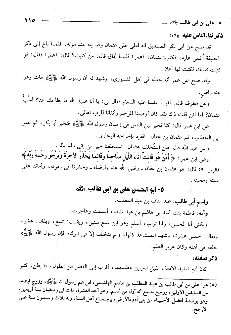 -5 هو: علي بن أبي طالب بن عبد المطلب بن هاشم الهاشمي ابن عم رسول الله صلى الله عليه وسلم وزوج ابنته من السابقين الأولين ورجح جمع أنه أول من أسلم وهو أحد العشرة مات في رمضان سنة أربعين وهو يومئذ أفضل الأحياء من بني آدم بالأرض بإجماع أهل السنة وله ثلاث وستون سنة على الأرجح.