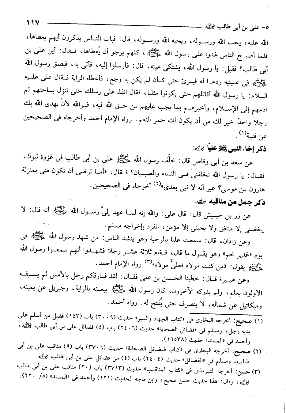 1 صحيح: أخرجه البخاري في كتاب الجهاد والسيرحديث 3009. باب 143. فضل من أسلم على يديه رجل ومسلم في فضائل الصحابة حديث 2406. باب 4. من فضائل علي ابن أبي طالب رضي الله عنه. وأحمد في المسند حديث 16538.