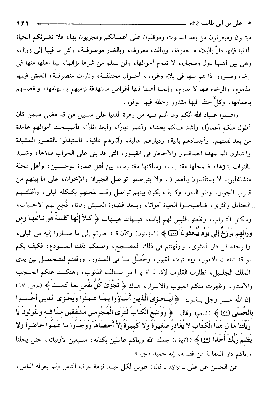واعلموا عباد الله إنكم وما انتم فيه من زهرة الدنيا على سبيل من قد مضى ممن كان أطول منكم اعمارا واشد منكم بطشا واعمر ديارا وابعد أثارا فأصبحت أموالهم هامدة من بعد نقلتهم وأجسادهم بالية وديارهم خالية وآثارهم عافية فاستبدلوا بالقصور المشيدة والنمارق الممهدة الصخور والأحجار في القبور التي قد بني على الخراب فناؤها وشيد بالتراب بناؤها فمحلها مقترب وساكنها مغترب بين أهل عمارة موحشين وأهل محلة متشاغلين لا يستأنسون بالعمران ولا يتواصلون تواصل الجيران والأخوان على ما بينهم من قرب الجوار ودنو الدار وكيف يكون بينهم تواصل وقد طحنهم بكلكله البلى وأظلتهم الجنادل والثرى فأصبحوا الحياة أمواتاً وبعد غضارة العيش رفاتاً فجع بهم الأحباب وسكنوا التراب وظعنوا فليس لهم إياب هيهات هيهات: {كَلَّا إِنَّهَا كَلِمَةٌ هُوَ قَائِلُهَا وَمِنْ وَرَائِهِمْ بَرْزَخٌ إِلَى يَوْمِ يُبْعَثُونَ} المؤمنون: 100] وكان قد صرتم إلى ما صاروا إليه من البلى والوحدة في دار المثوى وارتهنتم في ذلك المضجع وضمكم ذلك المستودع فكيف بكم لو قد تناهت الأمور وبعثرت القبور وحصل ما في الصدور ووقفتم للتحصيل بين يدي الملك الجليل فطارت القلوب لاشفاقها من سالف الذنوب وهتكت عنكم الحجب والأستار وظهرت منكم العيوب والأسرار هناك: {تُجْزَى كُلُّ نَفْسٍ بِمَا كَسَبَتْ} [غافر:17] أن الله عز وجل يقول: {لِيَجْزِيَ الَّذِينَ أَسَاءُوا بِمَا عَمِلُوا وَيَجْزِيَ الَّذِينَ أَحْسَنُوا بِالْحُسْنَى} [النجم: 31] وقال: {وَوُضِعَ الْكِتَابُ فَتَرَى الْمُجْرِمِينَ مُشْفِقِينَ مِمَّا فِيهِ وَيَقُولُونَ يَا وَيْلَتَنَا مَالِ هَذَا الْكِتَابِ لا يُغَادِرُ صَغِيرَةً وَلا كَبِيرَةً إِلَّا أَحْصَاهَا وَوَجَدُوا مَا عَمِلُوا حَاضِراً وَلا يَظْلِمُ رَبُّكَ أَحَداً} [الكهف: 49] جعلنا الله وإياكم عاملين بكتابه متبعين لأوليائه حتى يحلنا وإياكم دار المقامة من فضله {إِنَّهُ حَمِيدٌ مَجِيدٌ} .