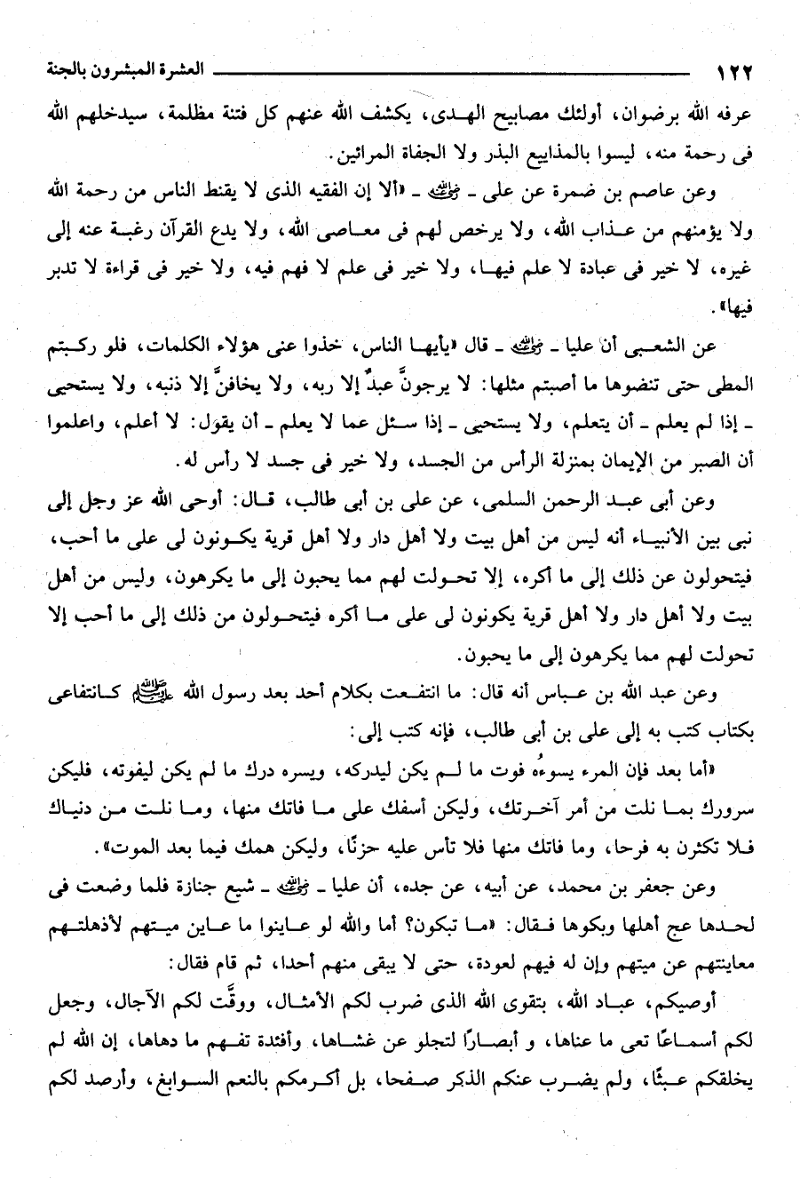 وعن جعفر بن محمد عن أبيه عن جده أن عليا رضي الله عنه شيع جنازة فلما وضعت في لحدها عج أهلها وبكوها فقال ما تبكون أما والله لو عاينوا ما عاين ميتهم لأذهلتهم معاينتهم عن ميتهم وان له فيهم لعودة ثم عودة حتى لا يبقي منهم أحداً ثم قام فقال: