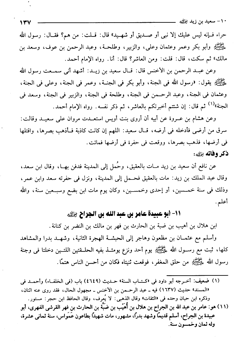 وعن عبد الرحمن بن الاخنس قال قال سعيد بن زيد أشهد اني سمعت رسول الله صلى الله عليه وسلم يقول: "رسول الله في الجنة وأبو بكر في الجنة وعمر في الجنة وعلي في الجنة وعثمان في الجنة وعبد الرحمن في الجنة وطلحة في الجنة والزبير في الجنة وسعد في الجنة 1 ثم قال أن شئتم أخبرتكم بالعاشر ثم ذكر نفسه رواه الإمام أحمد.
