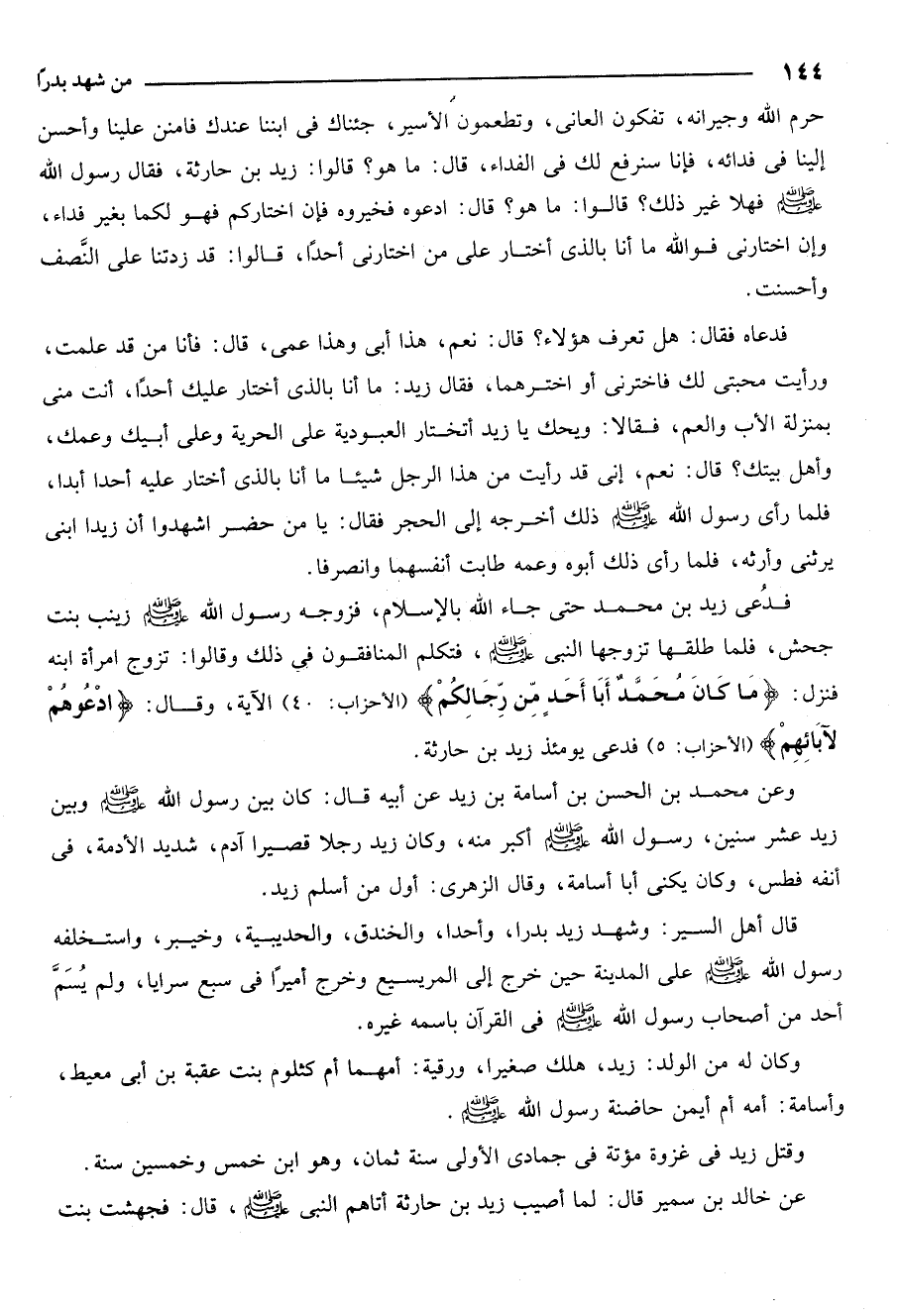 فدعي زيد بن محمد حتى جاء الله بالإسلام فزوجه رسول الله. صلى الله عليه وسلم زينب بنت جحش فلما طلقها تزوجها النبي. صلى الله عليه وسلم فتكلم المنافقون في ذلك وقالوا تزوج امرأة ابنه فنزل: {مَا كَانَ مُحَمَّدٌ أَبَا أَحَدٍ مِنْ رِجَالِكُمْ} [الاحزاب: 40] وقال: {ادْعُوهُمْ لِآبَائِهِمْ} [الاحزاب: 5] فدعي يومئذ زيد بن حارثة.