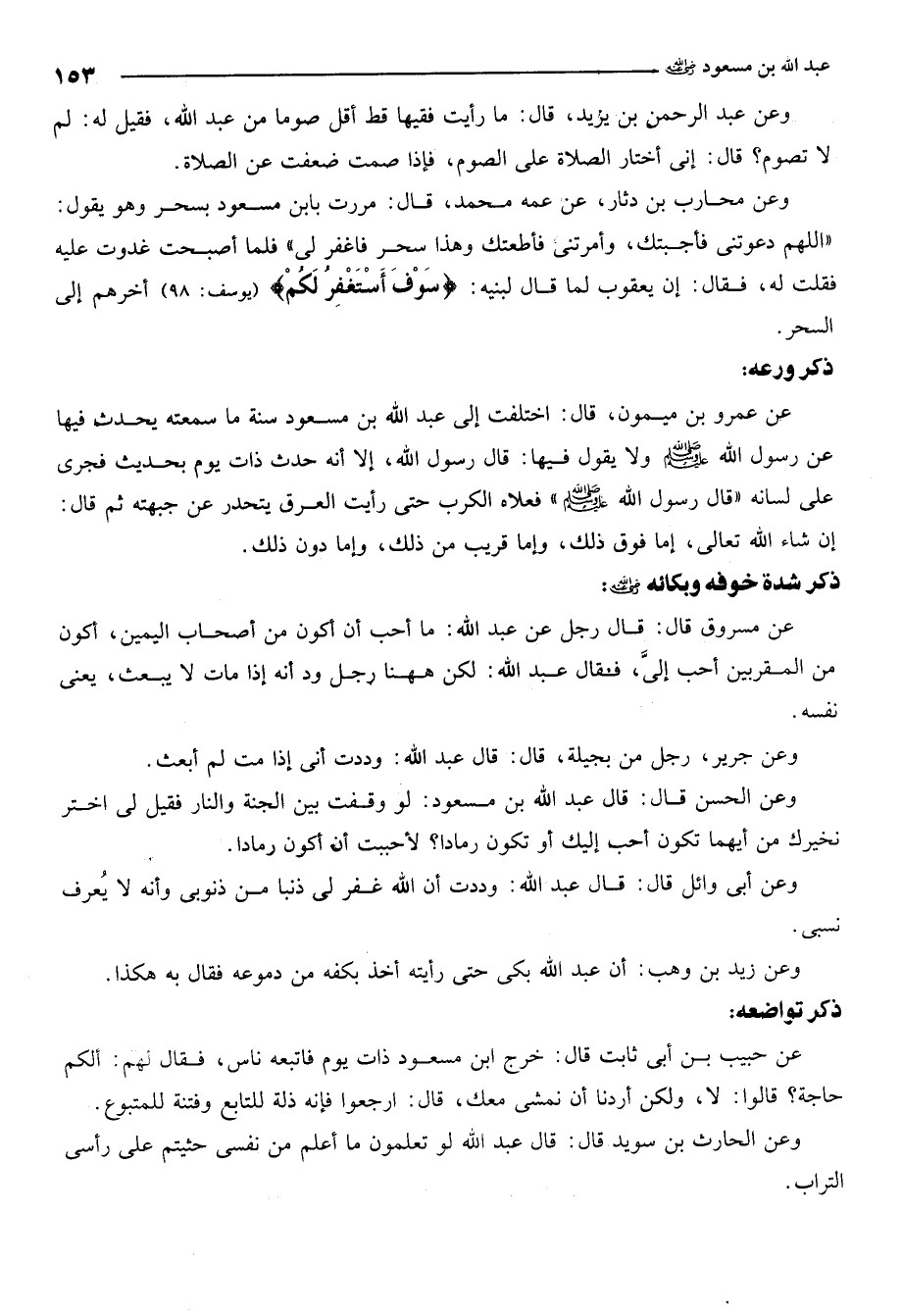 عن حبيب بن أبي ثابت قال خرج ابن مسعود ذات يوم فاتبعه ناس فقال لهم الكم حاجة قالوا لا ولكن أردنا أن نمشي معك قال ارجعوا فانه ذلة للتابع وفتنة للمتبوع. وعن الحارث بن سويد قال قال عبد الله لو تعلمون ما اعلم من نفسي حثيتم على رأسي التراب.
