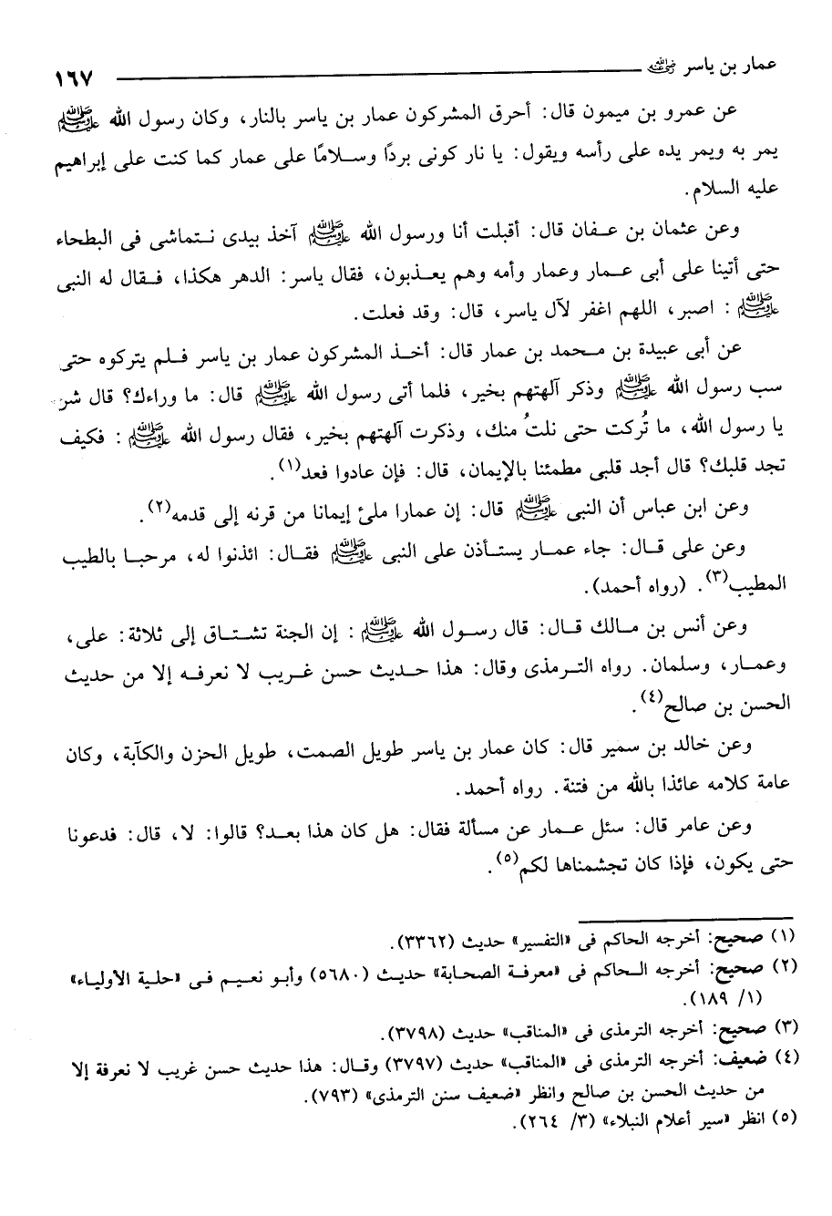 وعن عثمان بن عفان قال: أقبلت أنا ورسول الله صلى الله عليه وسلم آخذ بيدي نتماشى في البطحاء حتى أتينا على أبي عمار وعمارٍ وأمّه وهم يعذبون. فقال ياسر: الدهر هكذا. فقال له النبي صلى الله عليه وسلم: "أصبر، اللهم اغفر لآلِ ياسر". قال: وقد فعلت.