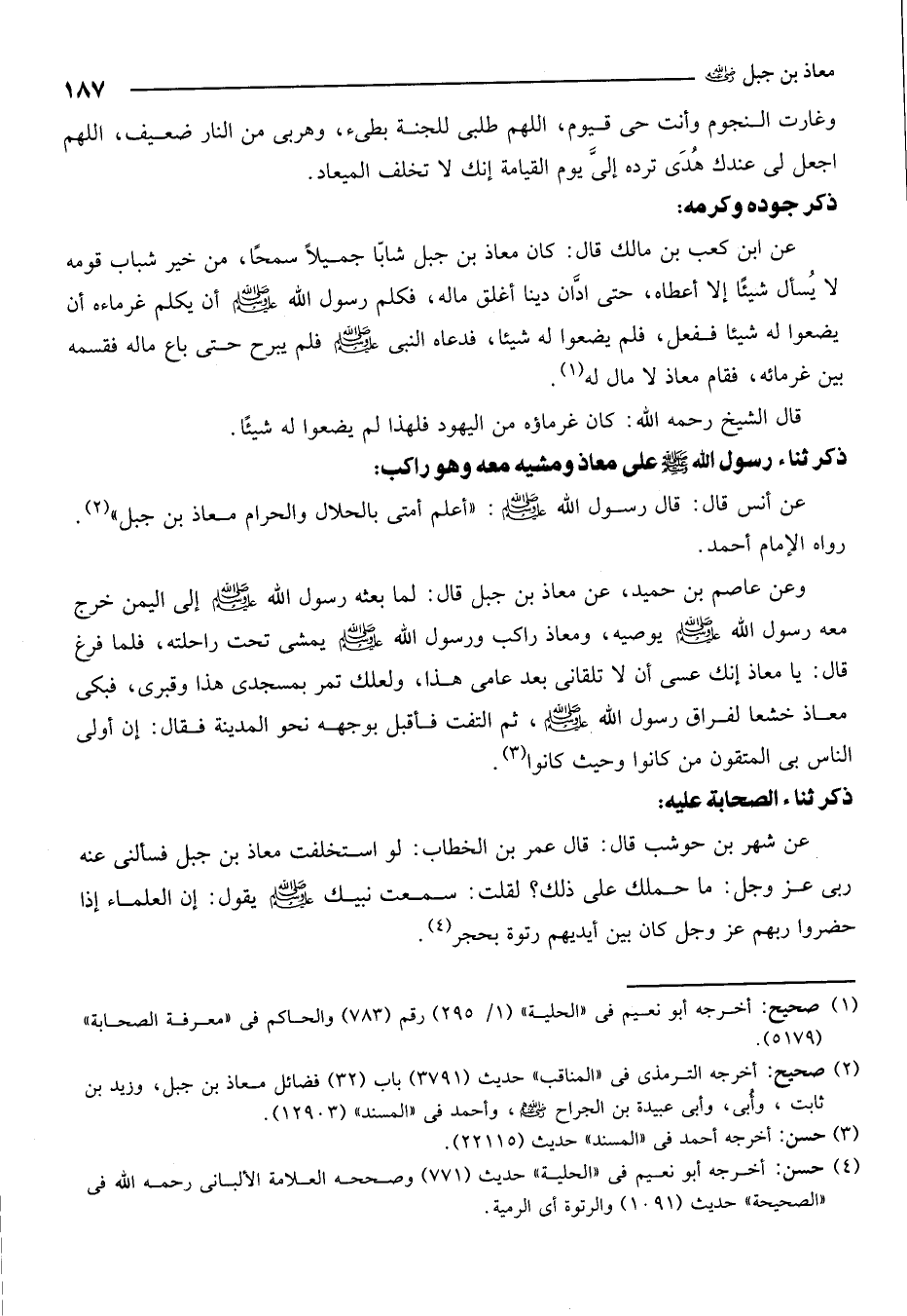 عن أنس قال: قال رسول الله صلى الله عليه وسلم: "أعلم أمتي بالحلال والحرام معاذ بن جبل" 2 رواه الإمام أحمد.