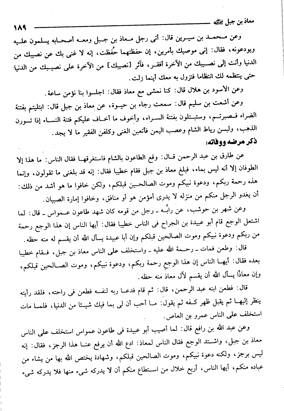 عن طارق بن عبد الرحمن قال: وقع الطاعون بالشام فاستغرقها فقال الناس: ما هذا إلا الطوفان إلا أنه ليس بماء فبلغ معاذ بن جبل فقام خطيباً فقال: إنه قد بلغني ما تقولون، وإنما هذه رحمة ربكم ودعوة نبيكم وكموت الصالحين قبلكم، ولكن خافوا ما هو أشد من ذلك، أن يغدو الرجل منكم من منزله لا يدري أمؤمنٌ هو أو منافق وخافوا إمارة الصبيان.