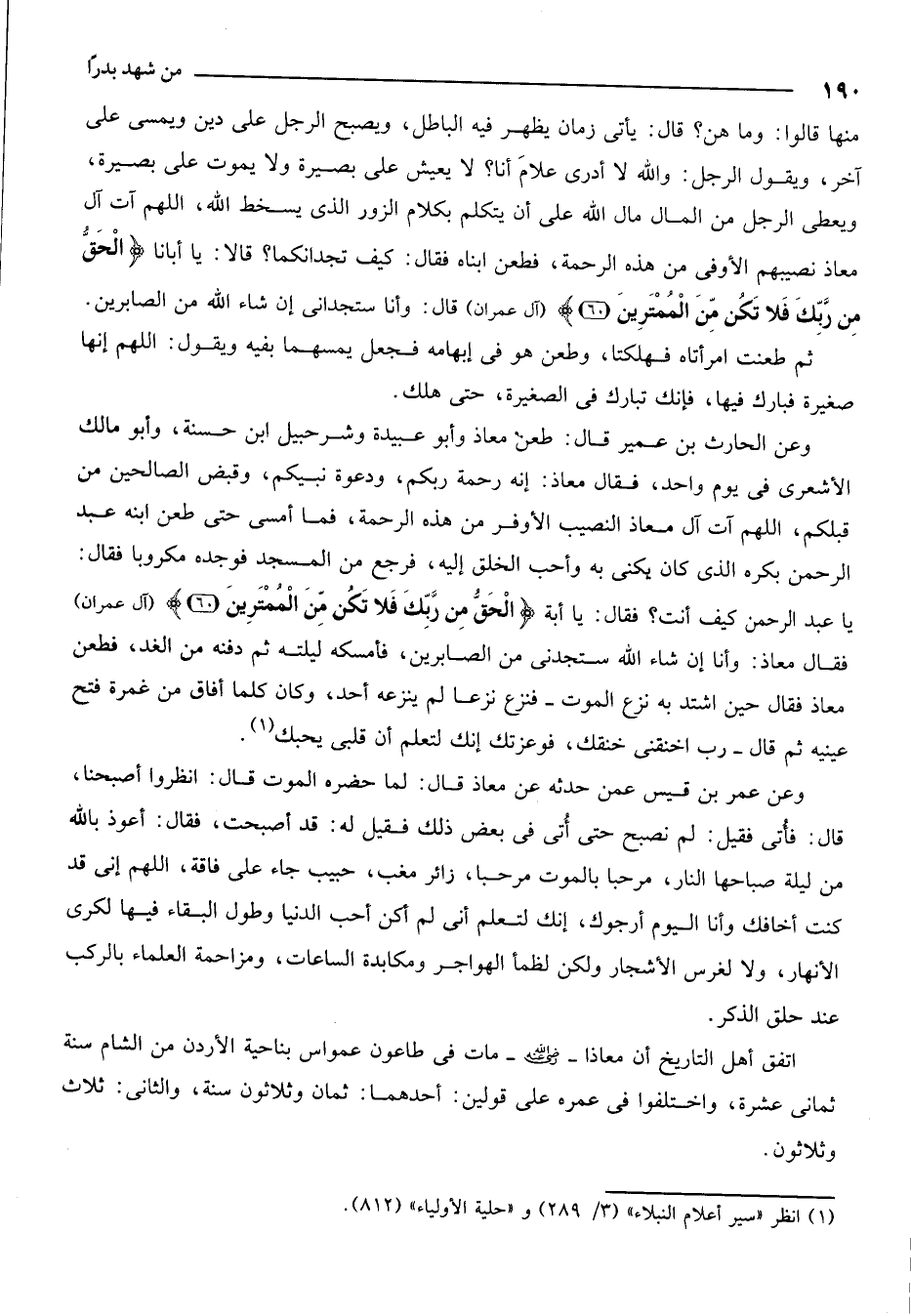 منها قالوا: وما هنَّ؟ قال: يأتي زمان يظهر فيه الباطل ويصبح الرجل على دين ويمسي على آخر، ويقول الرجل: والله لا أدري على ما أنا؟ لا يعيش على بصيرة ولا يموت على بصيرة، ويعطي الرجل من المال مال الله على أن يتكلم بكلام الزور الذي يسخط الله، اللهم آت آل معاذ نصيبهم الأوفى من هذه الرحمة. فطُعن ابناه فقال: كيف تجدانكما؟ قالا: يا أبانا، {الْحَقُّ مِنْ رَبِّكَ فَلا تَكُنْ مِنَ الْمُمْتَرِينَ} [آل عمران: 60] قال: وأنا ستجداني إن شاء الله من الصابرين.