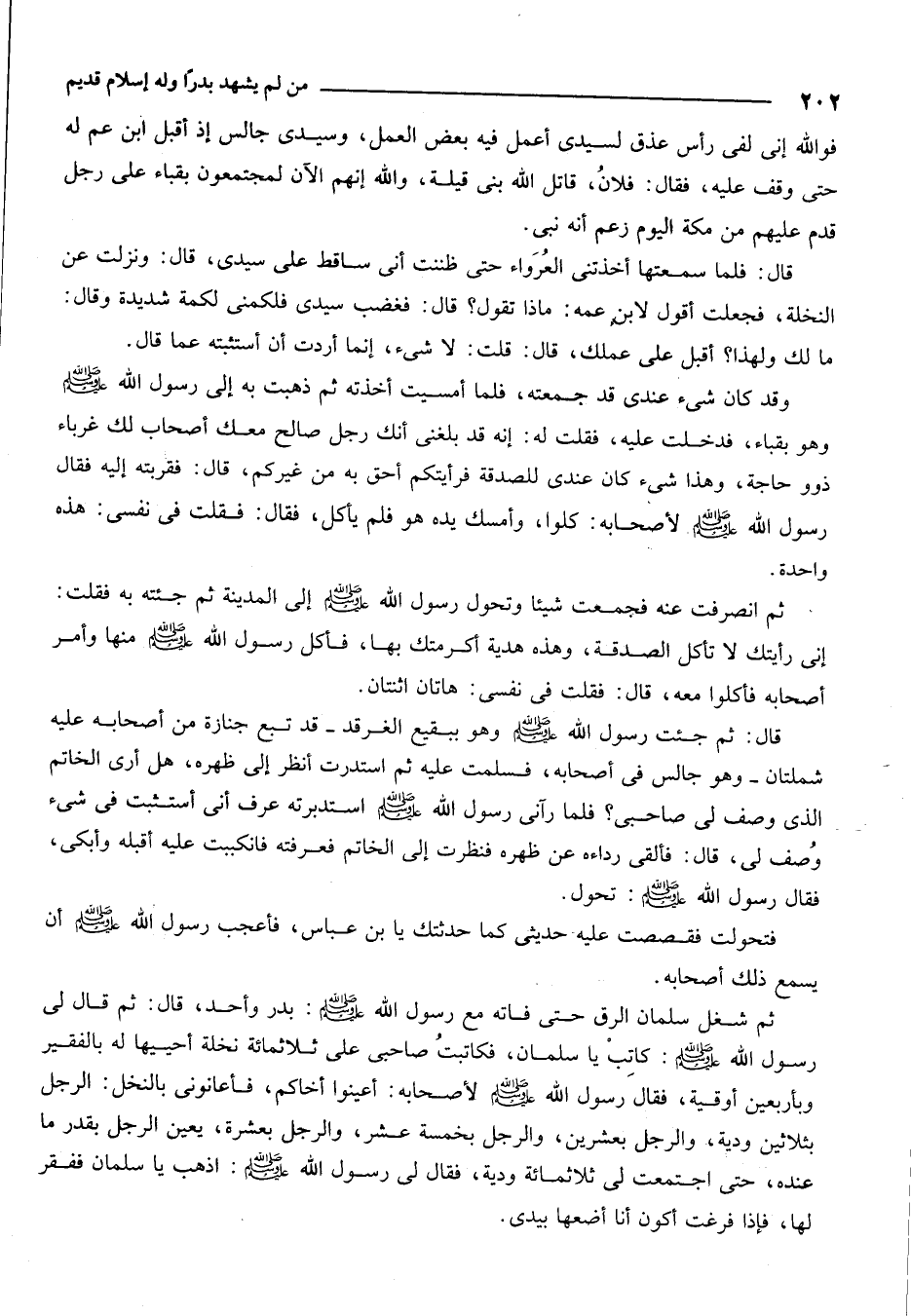 ثم شغل سلمان الرقُّ حتى فاته مع رسول الله: بدر واحد قال: ثم قال لي رسول الله. صلى الله عليه وسلم كاتبْ يا سلمان. فكاتبت صاحبي على ثلاثمائة نخلة أحييها له بالفَقِير وبأربعين أوقية. فقال رسول الله. صلى الله عليه وسلم لأصحابه: أعينوا أخاكم. فأعانوني بالنخل: الرجل بثلاثين وَدِيّة، والرجل بعشرين، والرجل بخمسة عشر، والرجل بعشرة يعين الرجل بقدر ما عنده. حتى اجتمعت لي ثلثمائة وَدِيّة فقال لي رسول الله صلى الله عليه وسلم: "اذهب يا سلمان فَفَقّر ِلها فإذا فرغت أكون أنا أضعها بيدي".
