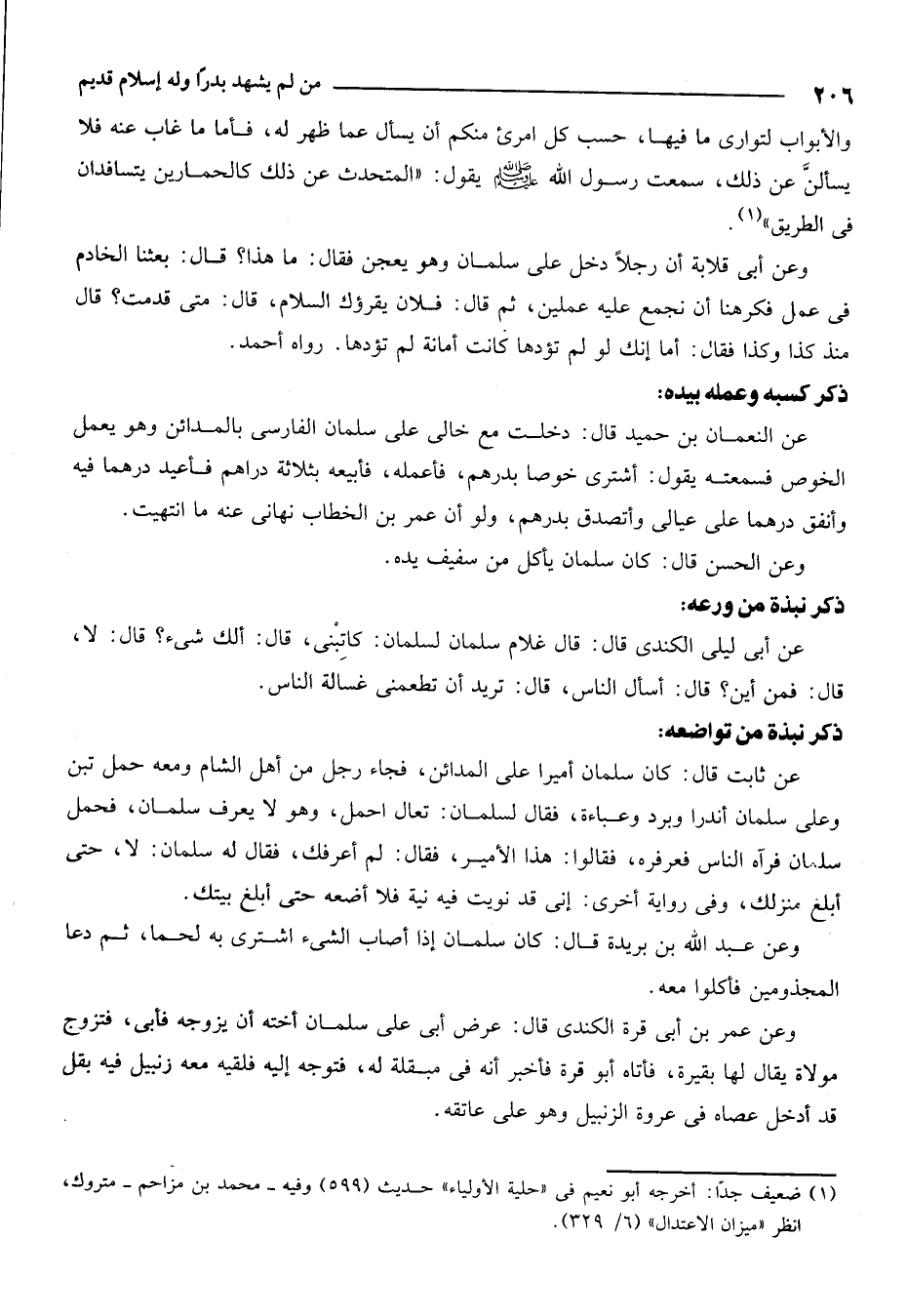 عن النعمان بن حميد قال: دخلت مع خالي على سلمان الفارسي بالمدائن وهو يعمل الخوص فسمعته يقول: أشتري خوصاً بدرهم فأعمله فأبيعه بثلاثة دراهم فأعيد درهماً فيه وأنفق درهماً على عيالي وأتصدق بدرهم، ولو أن عمر بن الخطاب نهاني عنه ما انتهيت.