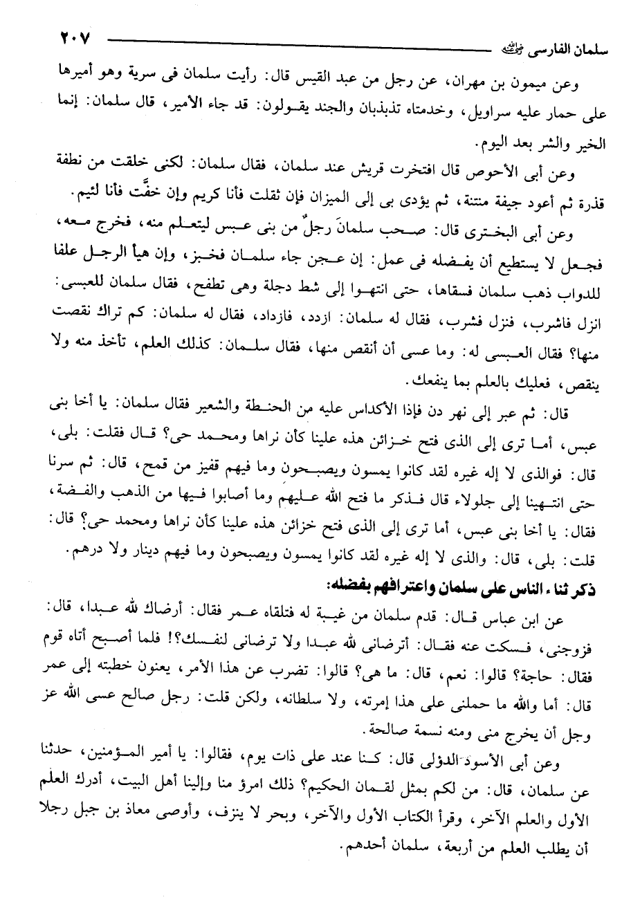 وعن أبي الاسود الدؤلي قال كنا عند علي ذات يوم فقالوا يا امير المؤمنين حدثنا عن سلمان قال من لكم بمثل لقمان الحكيم ذلك امرؤ منا والينا أهل البيت ادرك العلم الأول والعلم الاخر وقرا الكتاب الأول والاخر وبحر لا ينزف وأوصى معاذ بن جبل رجلا ان يطلب العلم من اربعة سلمان أحدهم.