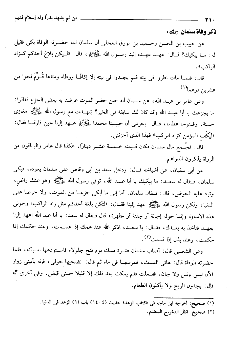 وعن عامر بن عبد الله عن سلمان أنه حين حضر الموت عرفنا به بعض الجزع فقالوا ما يجزعك يا أبا عبد وقد كان لك سابقة في الخير شهدت مع رسول الله صلى الله عليه وسلم مغازي حسنة وفتوحا عظاما قال يحزنني ان حبيبنا محمدا صلى الله عليه وسلم عهد الينا حين فارقنا فقال ليكف المؤمن كزاد الراكب فهذا الذي احزنني.