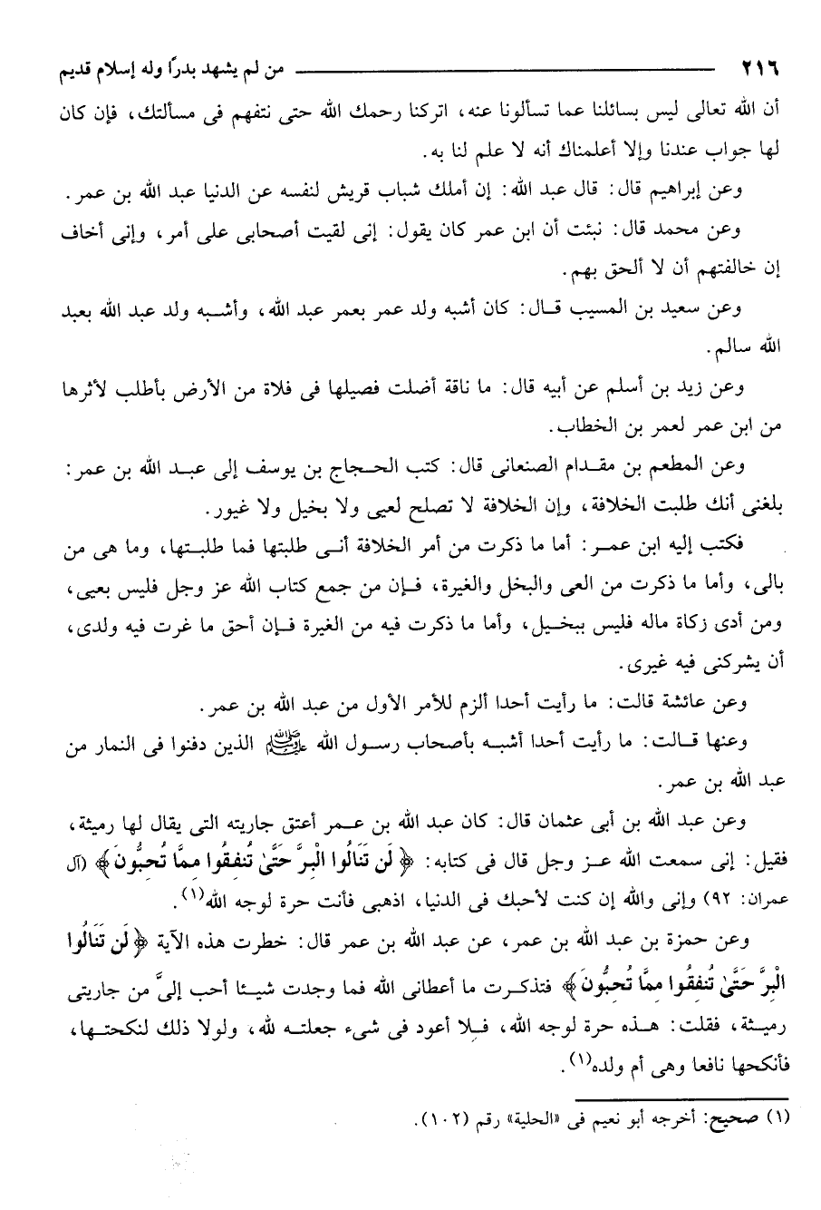 وعن عبد الله بن أبي عثمان قال كان عبد الله بن عمر اعتق جاريته التي يقال لها رميثة فقيل اني سمعت الله عز وجل قال في كتابه: {لَنْ تَنَالُوا الْبِرَّ حَتَّى تُنْفِقُوا مِمَّا تُحِبُّونَ} [آل عمران: 92] واني والله ان كنت لاحبك في الدنيا اذهبي فانت حرة لوجه الله.