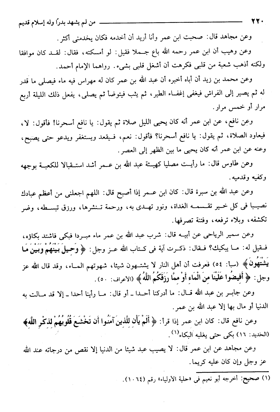 وعن نافع عن ابن عمر أنه كان يحيي الليل صلاة ثم يقول يا نافع اسحرنا؟ فاقول لا فيعاود الصلاة ثم يقول يا نافع اسحرنا؟ فأقول نعم فيقعد ويستغفر ويدعو حتى يصبح وعنه عن ابن عمر أنه كان يحيي ما بين الظهر والعصر.