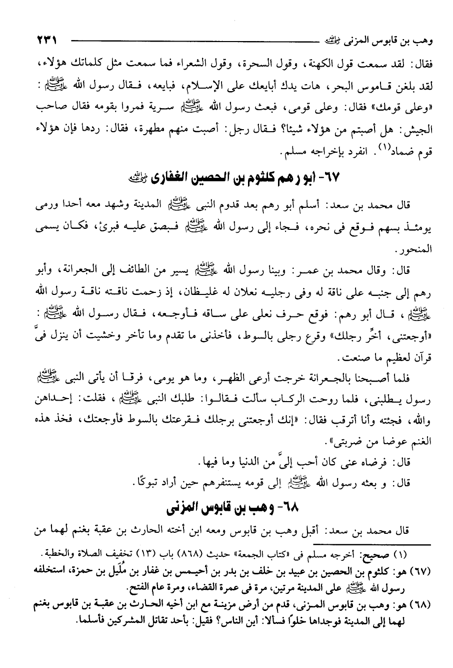 68- هو: وهب بن قابوس المزني قدم من أرض مزينة مع ابن أخيه الحارث بن عقبة بن قابوس بغنم لهما إلى المدينة فوجداها خلوا فسألا: أين الناس؟ فقيل: بأحد تقاتل المشركين فأسلما.