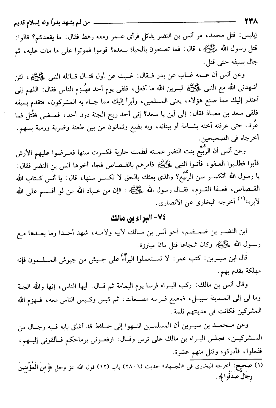 1 صحيح: أخرجه البخاري في الجهاد حديث 2806. باب 12. قول الله عزوجل: {مِنَ الْمُؤْمِنِينَ رِجَالٌ صَدَقُوا} .