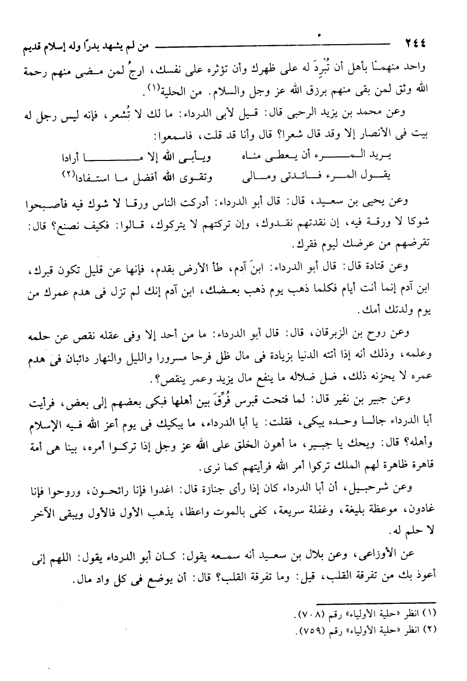 وعن محمد بن يزيد الرحبي قال قيل لأبي الدرداء ما لك لا تشعر فانه ليس رجل له بيت في الأنصار إلا وقد قال شعرا؟ قال وانا قد قلت فاسمعوا: