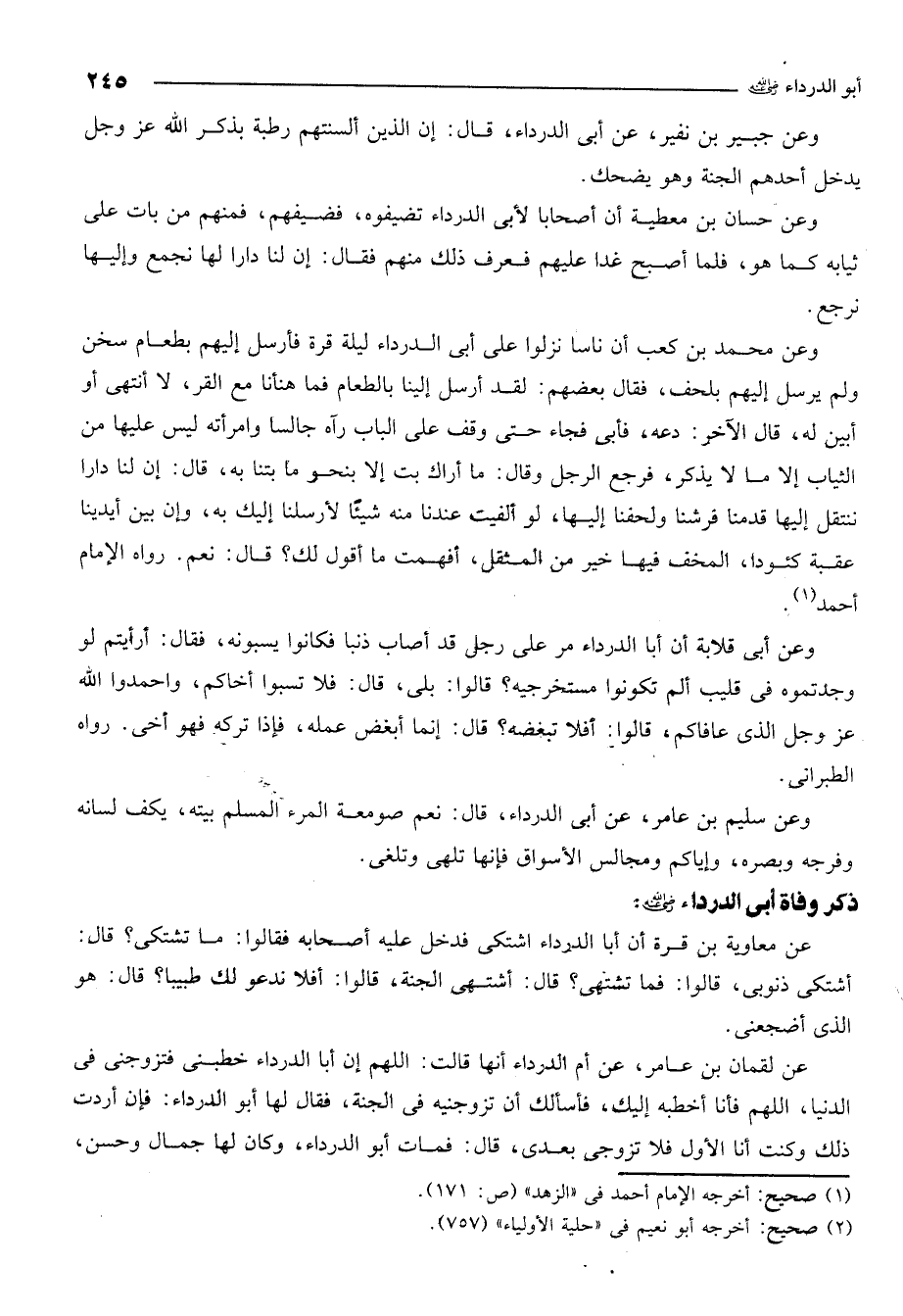 وعن محمد بن كعب أن ناساً نزلوا على أبي الدرداء ليلة قرّة فارسل لهم بطعام سخن ولم يرسل الايهم بلحف. فقال بعضهم لقد ارسل إلينا بالطعام فما هنأنا مع القُرّ لا انتهي أو ابين له. قال الاخر: دعه فأبى فجاء حتى وقف على الباب رآه جالساً وامرأته ليس عليها من الثياب إلا ما يذكر. فرجع الرجل وقال: ما اراك بت إلا بنحو ما بتنا به. قال: ان لنا داراً ننتقل إليها قدّمنا ولحفنا إليها ولو ألقيت عندنا منه شيئاً لأرسلنا اليك به، وان بين أيدينا عقبة كَؤوداً المخفّ فيها خير من المثقل، افهمت ما اقول لك؟ قال نعم. رواه أحمد1.