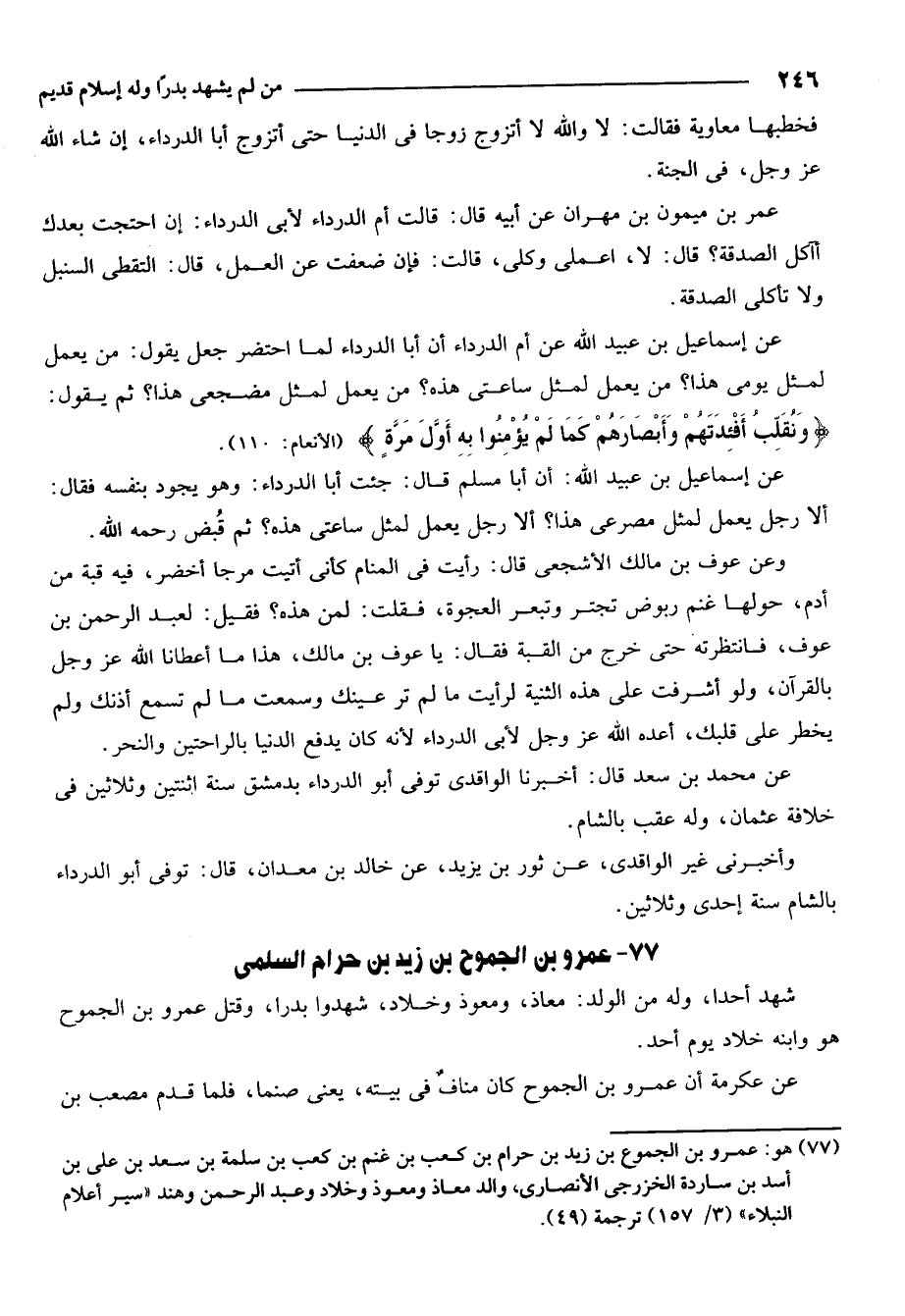 77- هو: عمرو بن الجموح بن زيد بن حرام بن كعب بن غنم بن كعب بن سلمة بن سعد بن علي بن أسد بن ساردة الخزرجي الأنصاري والد معاذ ومعوذ وخلاد وعبد الرحمن وهند سير أعلام النبلاء 3/157. ترجمة 49.