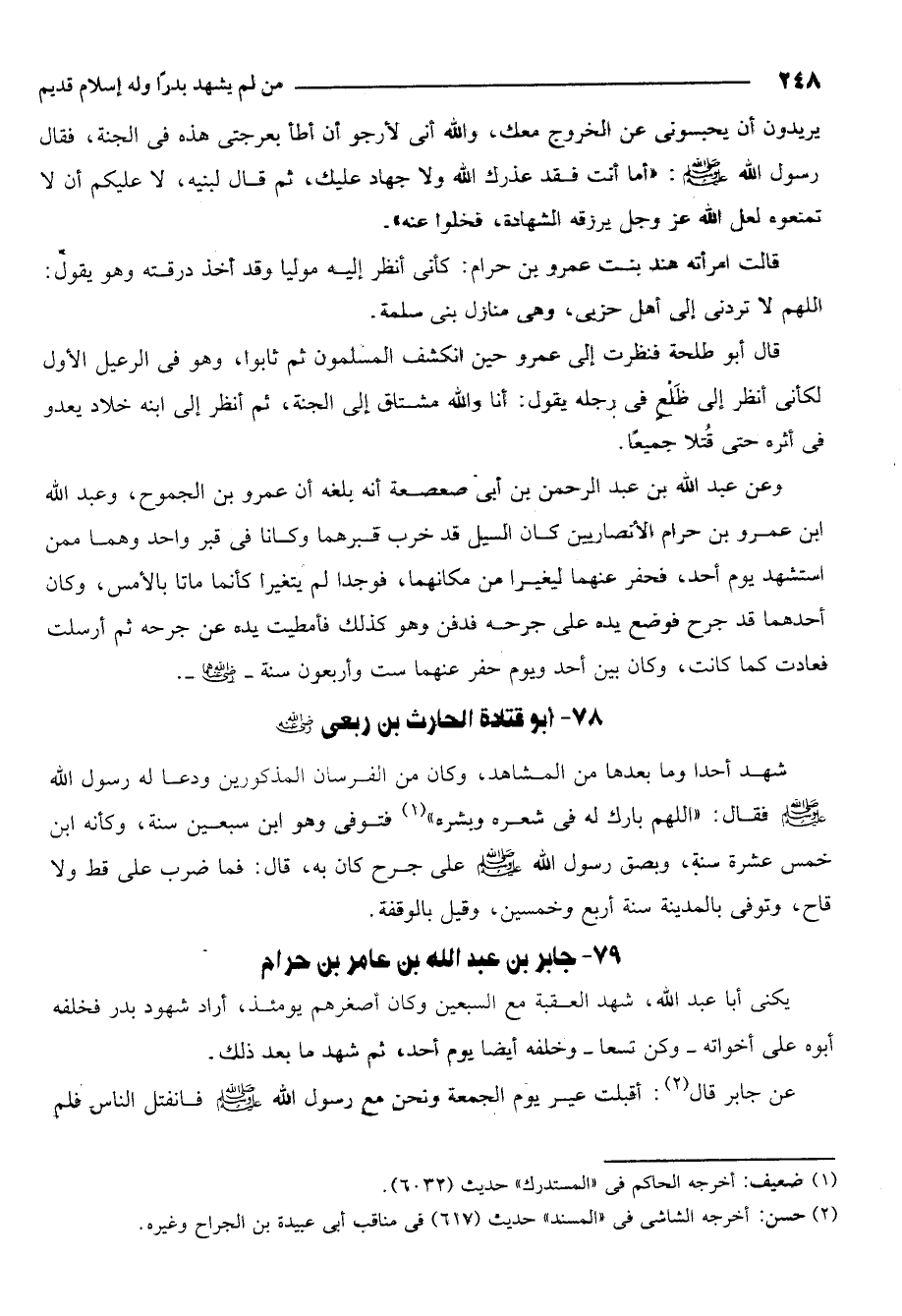 يريدون ان يحبسوني عن الخروج معك والله اني لأرجو ان أطأ بعرجتي هذه في الجنة فقال رسول الله صلى الله عليه وسلم: " أما أنت فقد عذرك الله ولا جهاد عليك ثم قال لبنيه لا عليكم ان لاتمنعوه لعل الله عز وجل يرزقه الشهادة فخلوا عنه".